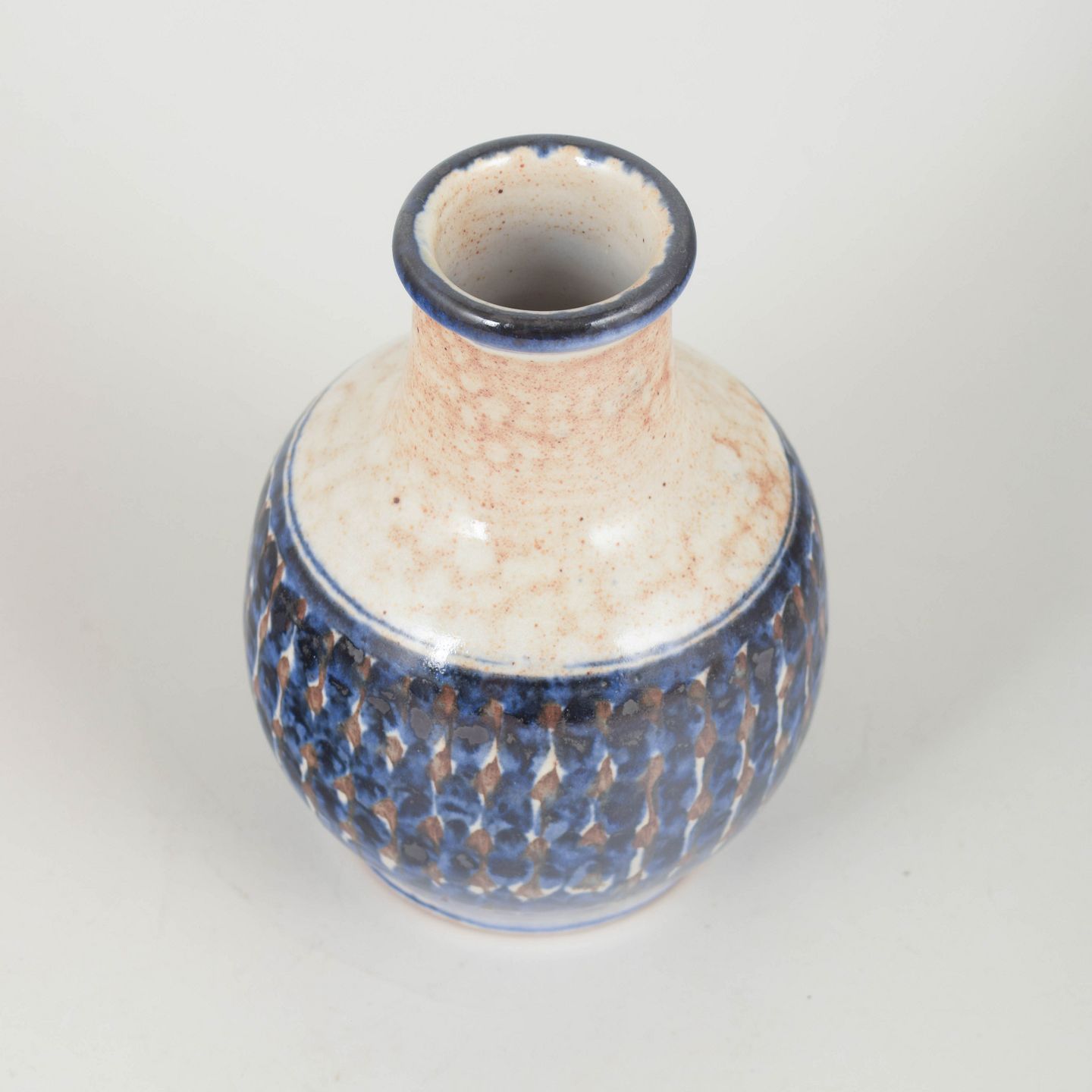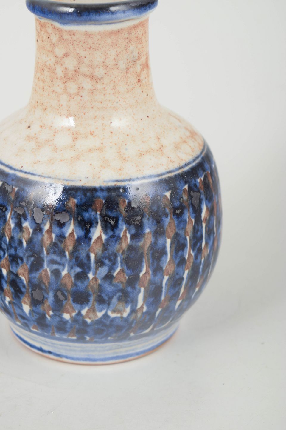 Hånddrejet stentøjsvase med cylindrisk hals og rundet korpus, dekoreret med en taktil, håndmalet blå og brun reliefglasur samt lyst plettet topstykke – et fint eksempel på Hjorths karakteristiske teksturerede overflader.