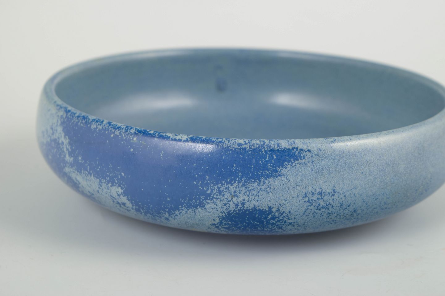 Hånddrejet stentøjsskål i lav, rund form med mat blå glasur i nuancerede toner, typisk for Hjorths eksperimenterende overflader i perioden.