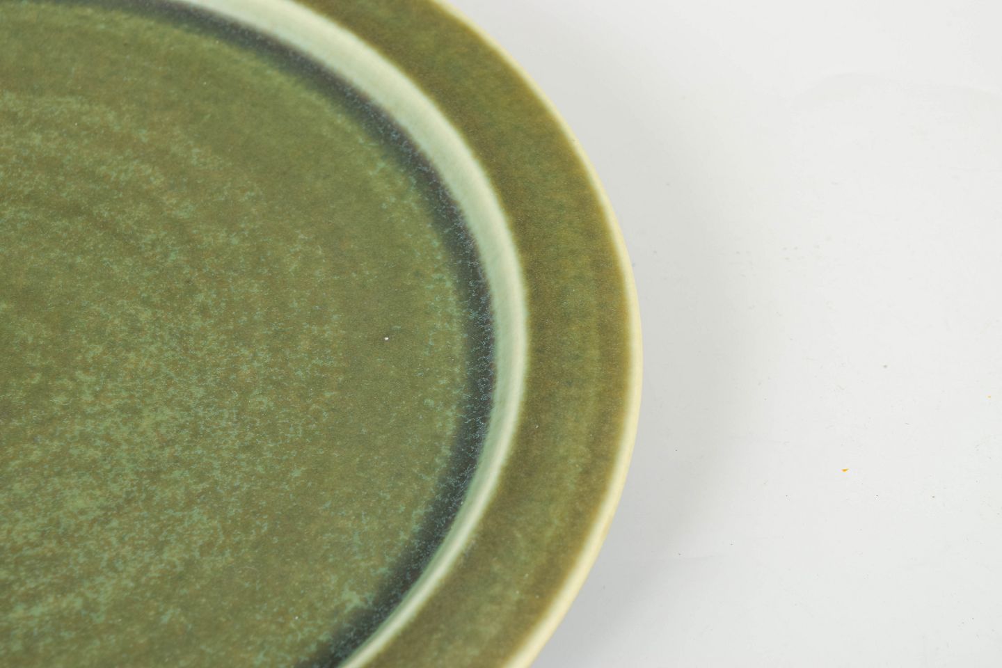 Stort, enkelt formet stentøjsfad i klassisk Saxbo-udtryk med den karakteristiske matte, nuancerede grønne glasur. Formen er rolig og harmonisk, og farvetonen understreger værkstedets modernistiske æstetik. Fadet er i 3. sortering, hvilket afspejles i mindre produktionsrelaterede ujævnheder.
