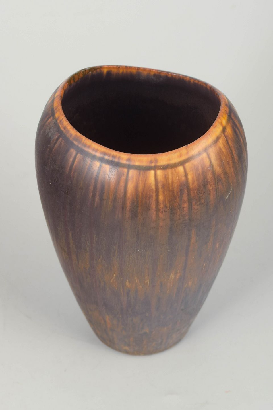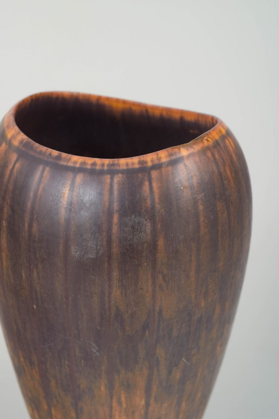 Høj, organisk formet vase i stentøj med smuk brunlig løbeglasur og varme ravtoner, typisk for Nylunds sofistikerede mellemkrigs- og efterkrigsæstetik.