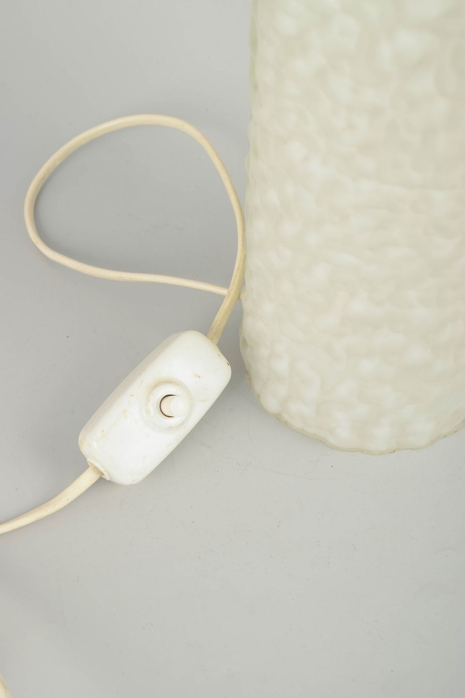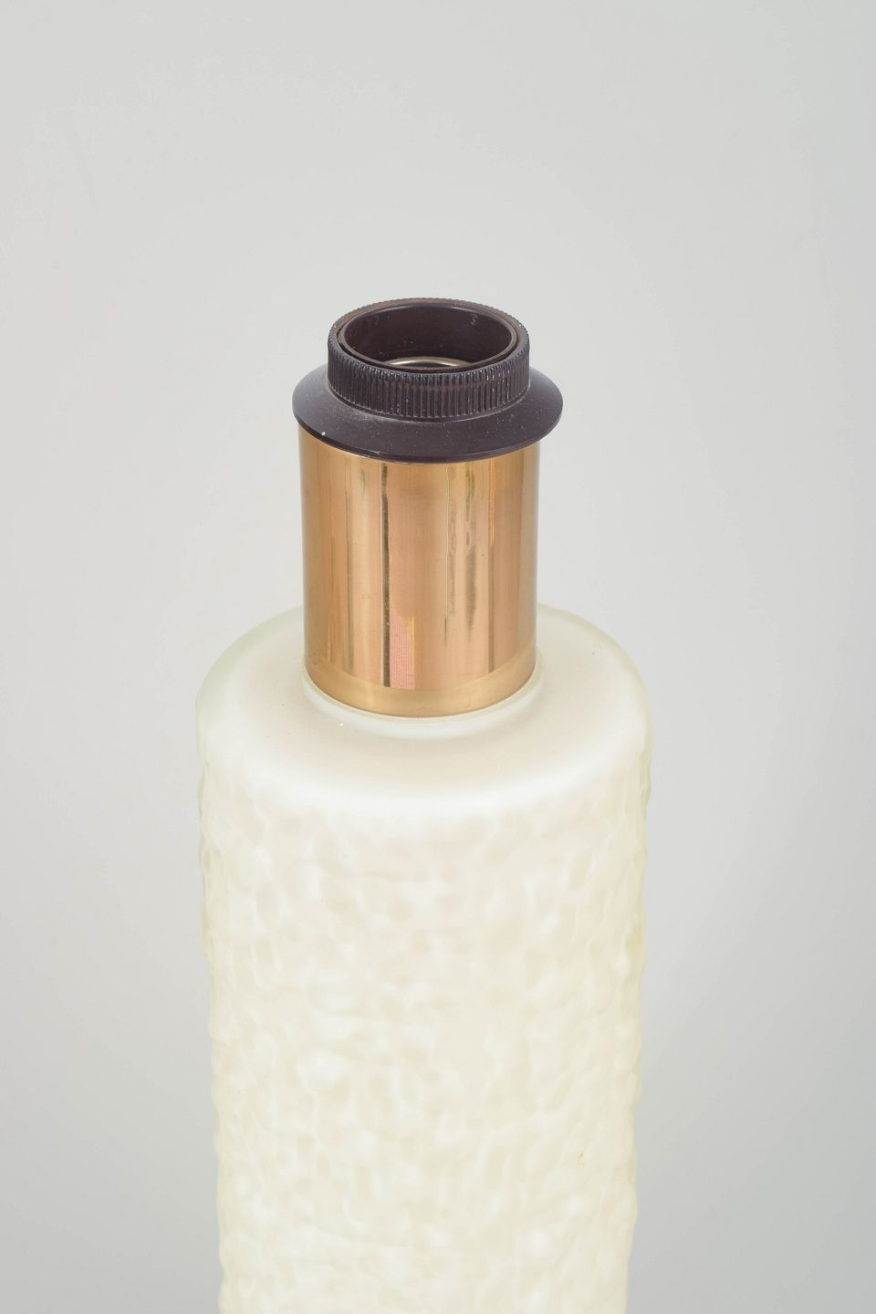Elegant bordlampe i presset hvidt glas med struktureret overflade og cylinderformet messingtop. Original ledning ca. 2 meter. Et karakteristisk stykke skandinavisk 70’er-belysningsdesign med enkel, men markant materialekontrast.