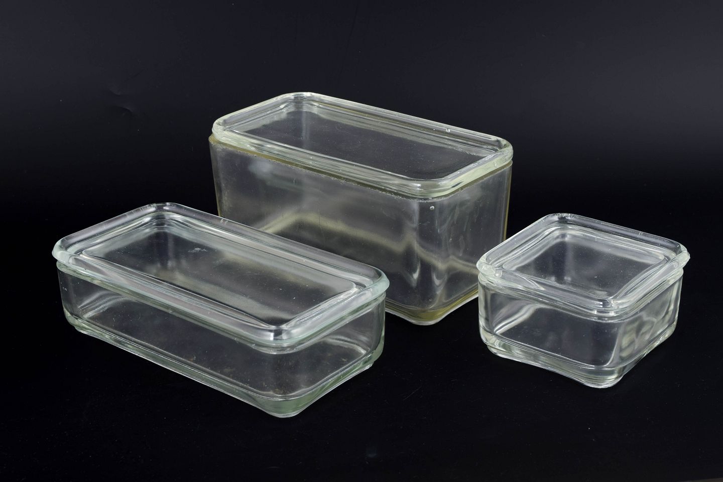 Sæt af tre rektangulære opbevaringsbokse i klart glas fra Wilhelm Wagenfelds ikoniske “Kubus”-serie. Serien forener funktionalistisk Bauhaus-æstetik med enkle proportioner og høj brugsværdi. Højdeinterval 5–9 cm, længde 8–18 cm.