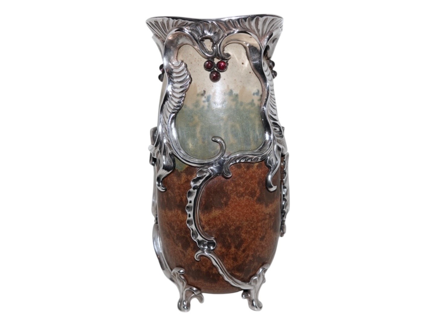 Royal Copenhagen keramik, stor og unik Patrick Nordström vase med original, ekstravagant og kraftig sølvmontering og ametyster.