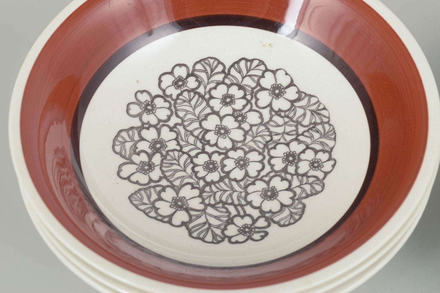 Sæt på 4 dybe stentøjstallerkener med den klassiske Agneta-dekoration: et centralt grafisk blomsterfelt i sorte linjer, omgivet af den varme rødbrune kant, karakteristisk for serien. Ideelle som suppetallerkener eller pastaskåle.
