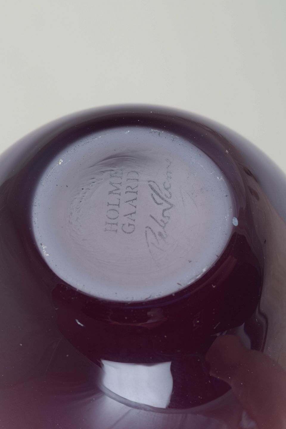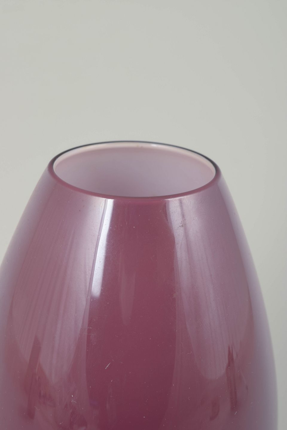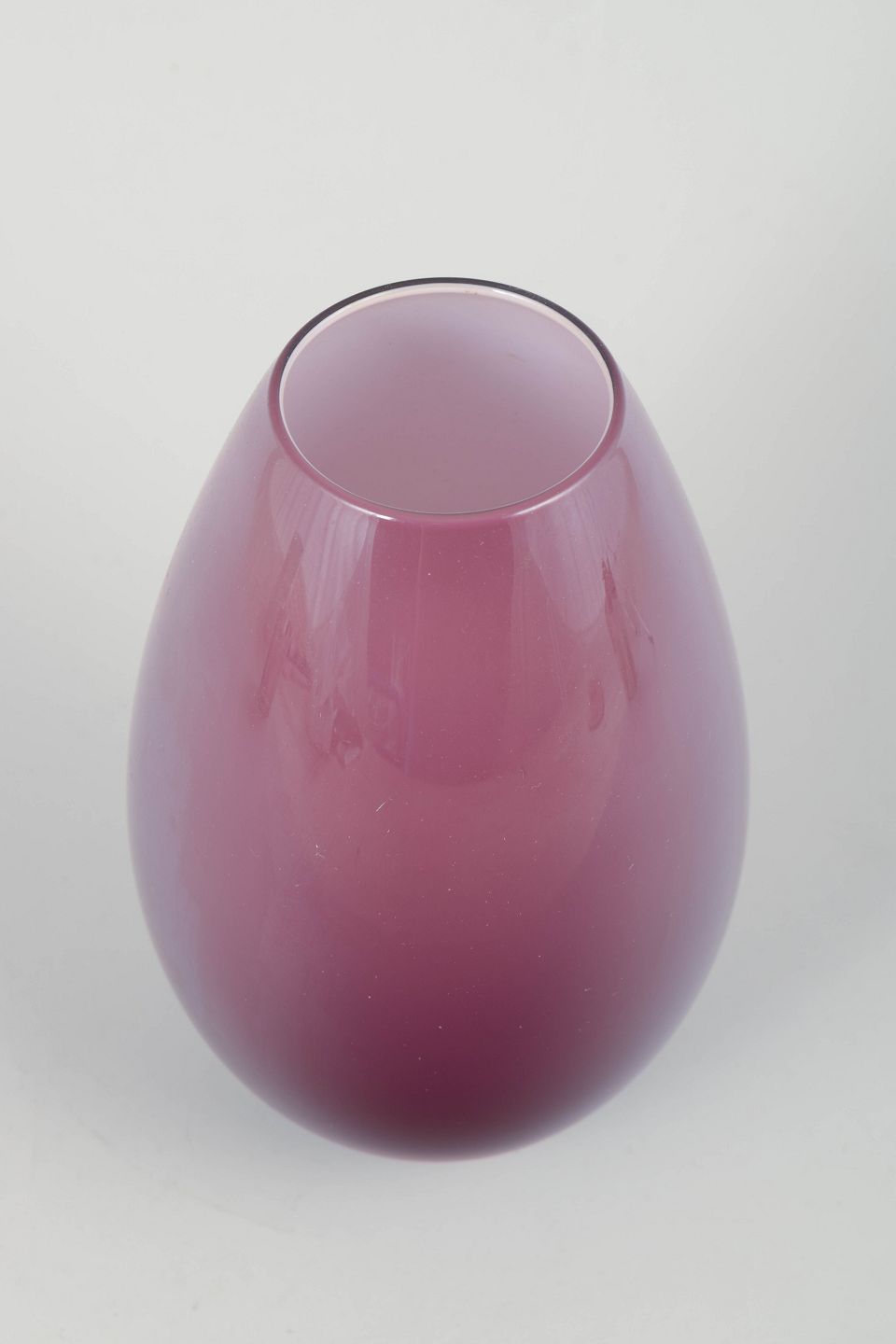 Elegant håndblæst vase i dyb lilla farve fra Peter Svarrers ikoniske “Cocoon”-serie for Holmegaard. Den bløde, organiske æggeform og den transparente tone understreger seriens moderne, skulpturelle udtryk.