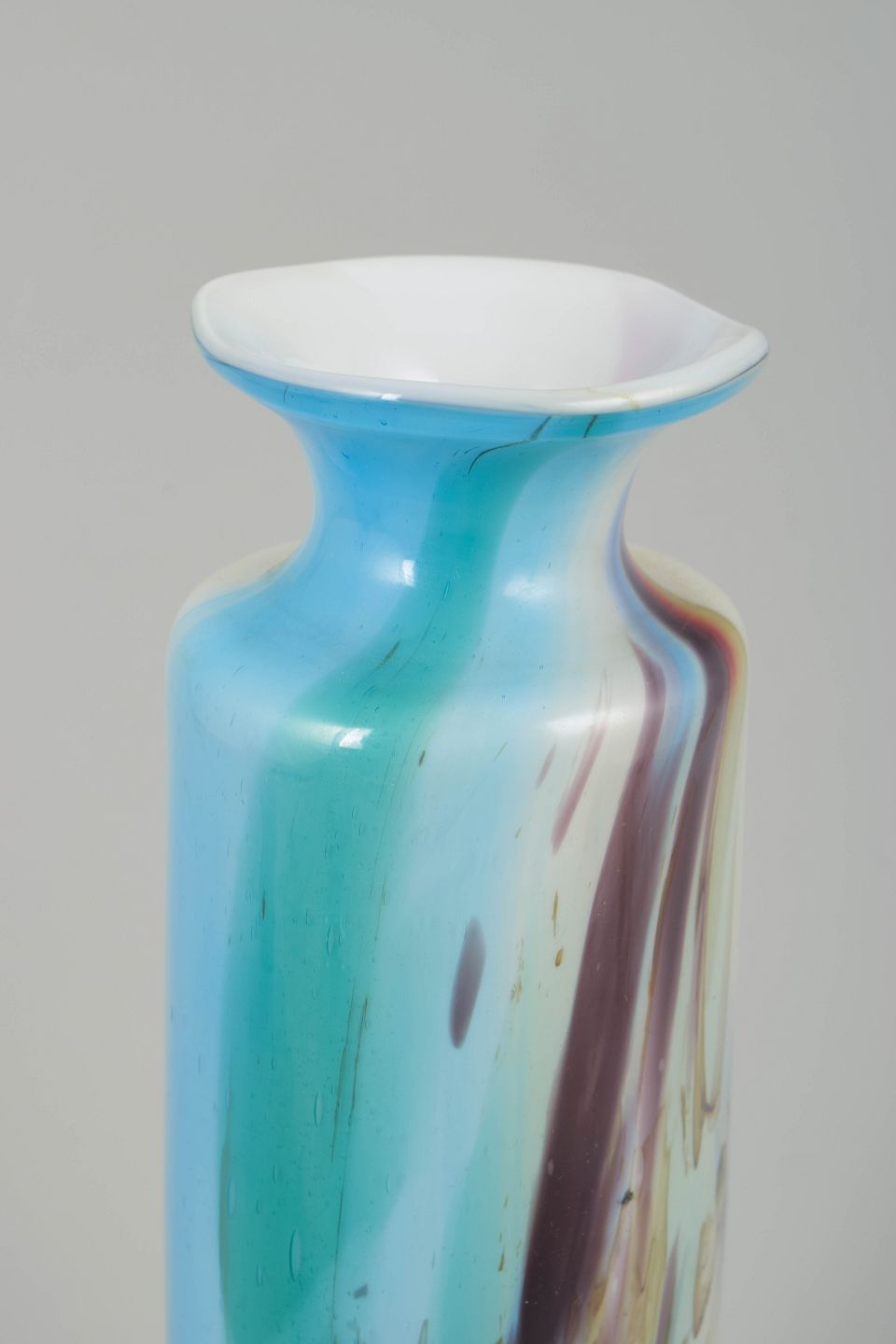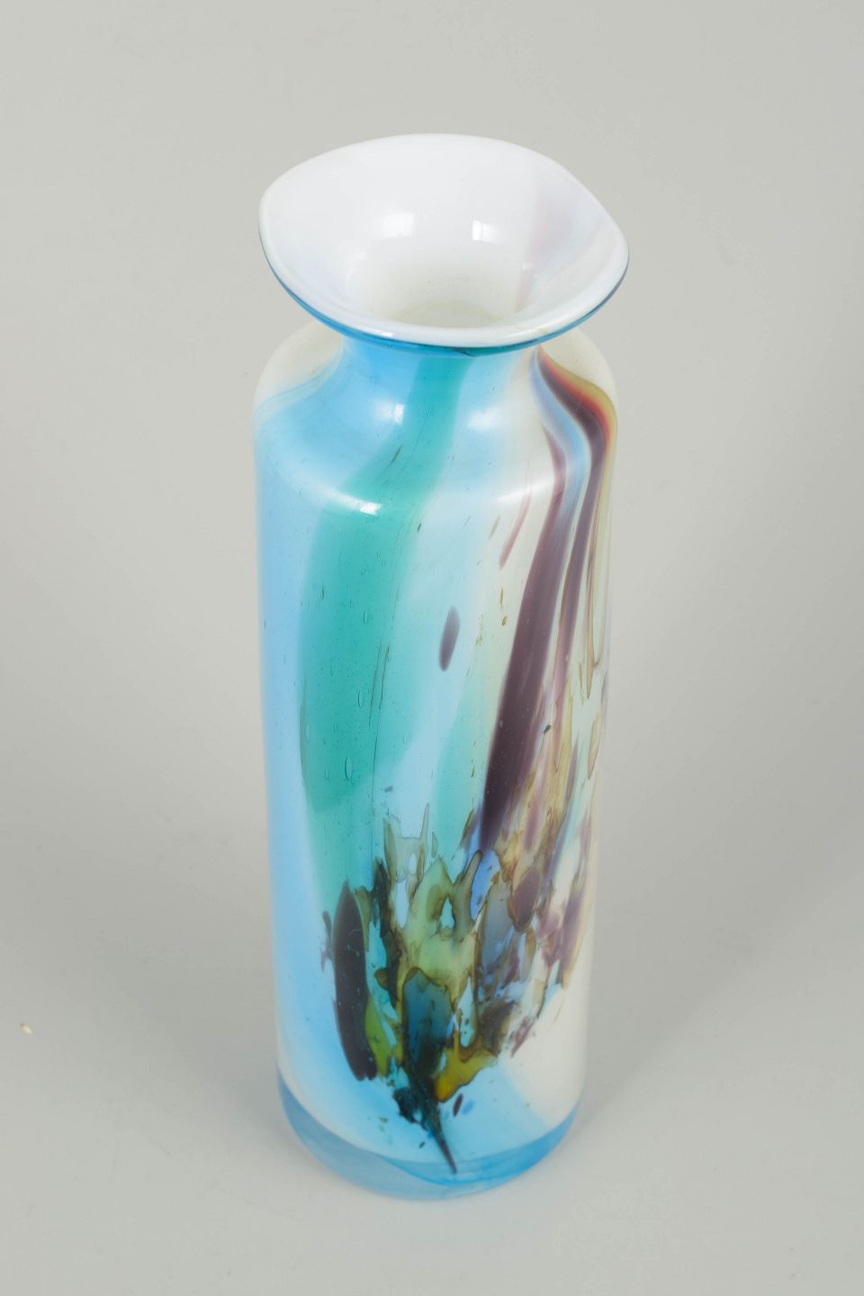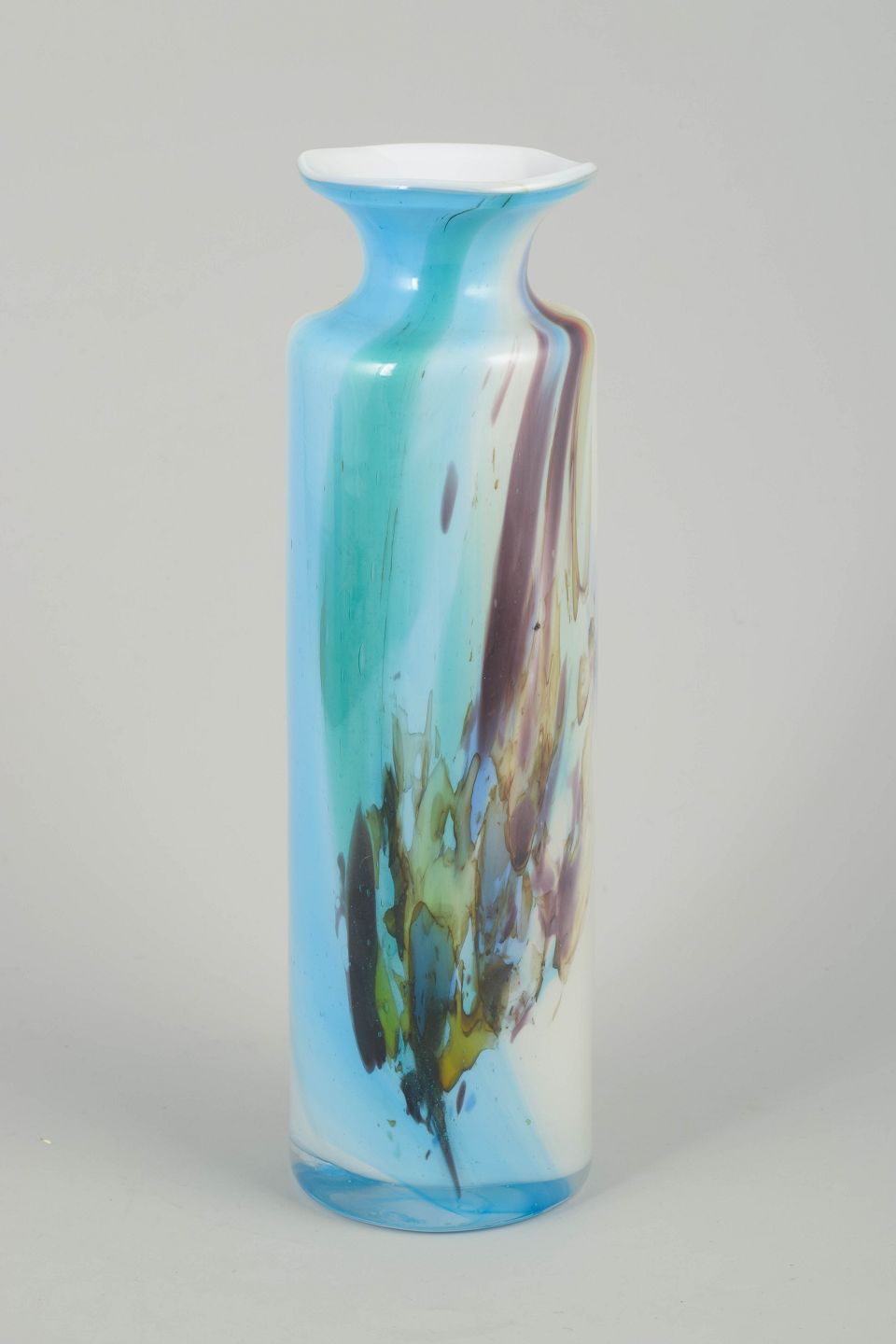 Mundblæst, høj og cylindrisk glasvase af Per Lütken med markante indsmeltede farvefelter i turkis, hvid, brun, gul og grøn. Farverne flyder ud i et malerisk, næsten abstrakt spil, og den udsvajede hals giver vasen et elegant, skulpturelt udtryk.