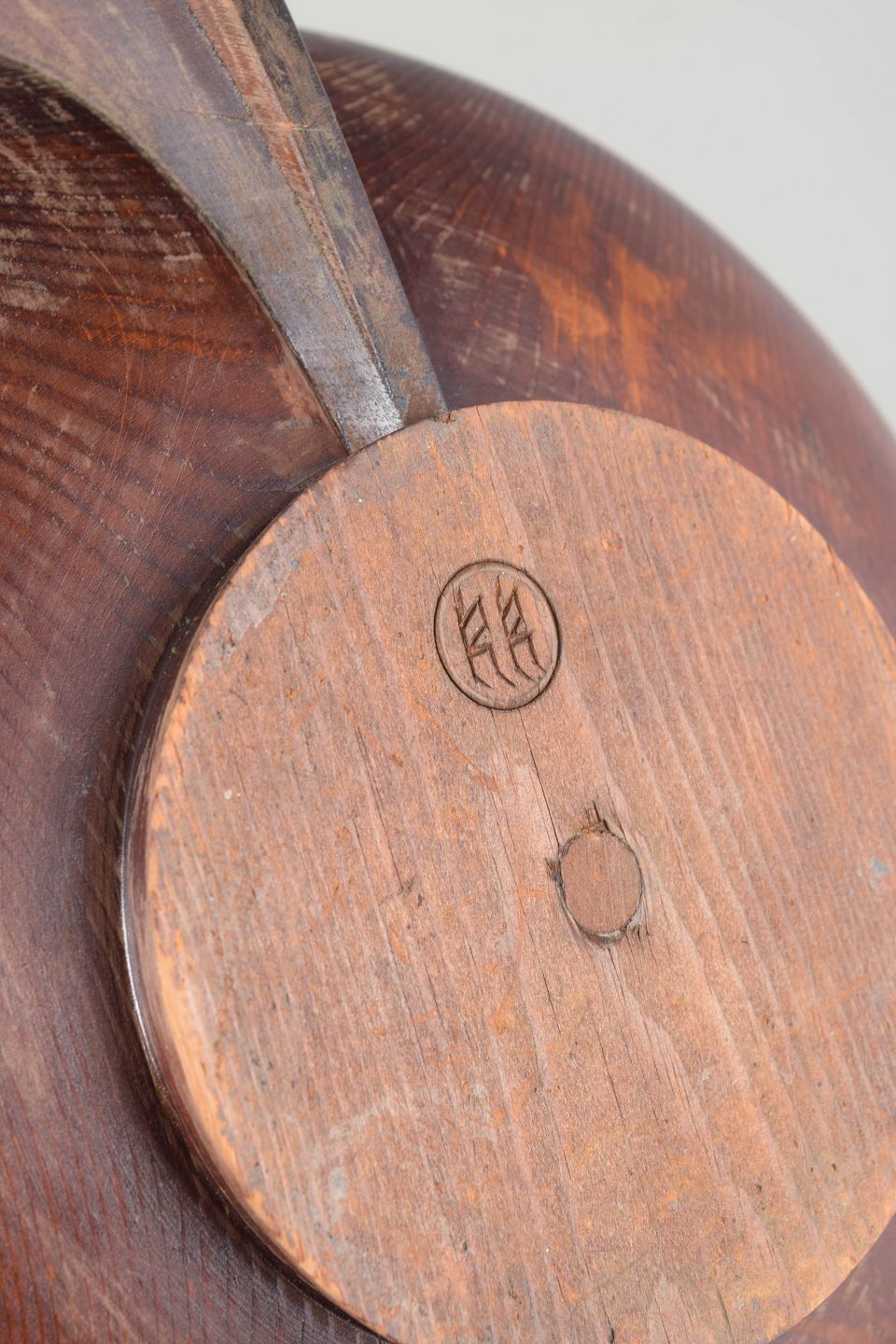 Dekorativ, håndudskåret træskål med karakteristiske dobbeltstående fuglehoveder i hver side – et motiv stærkt forbundet med Kalevala Korus tidlige formsprog. Den varme patina og de fint gennembrudte detaljer understreger Paaers særlige evne til at forene nordisk ornamentik med funktionelt kunsthåndværk. Signeret.