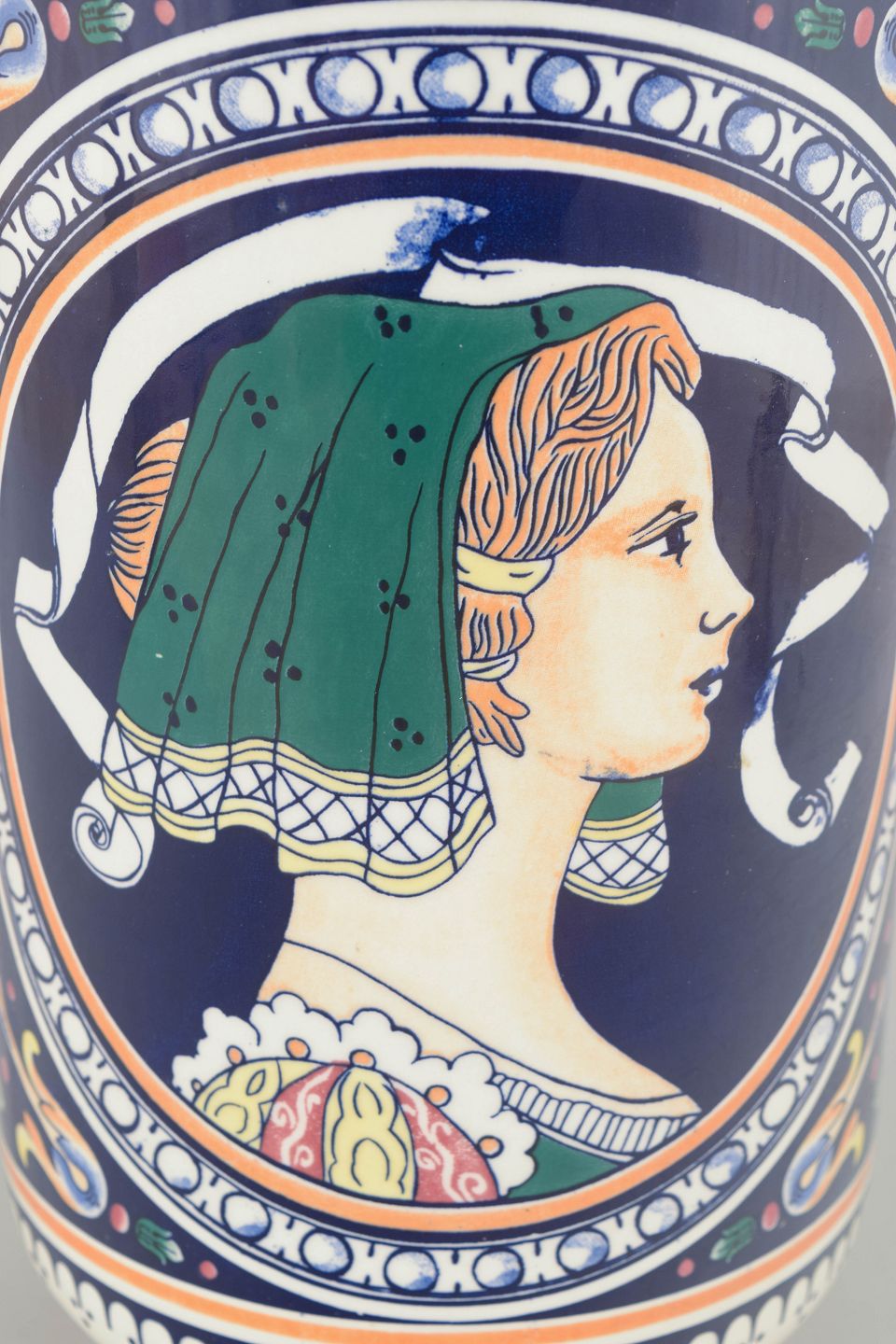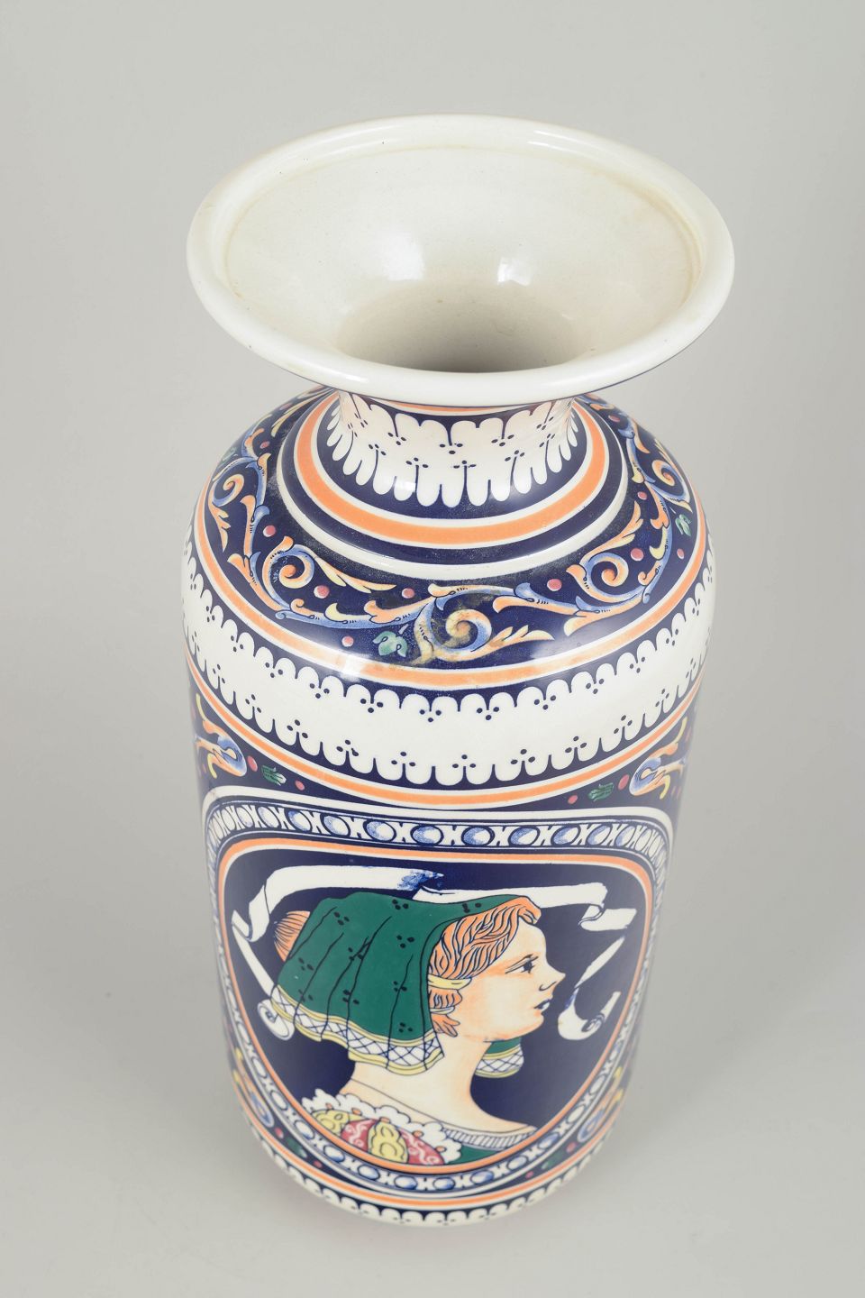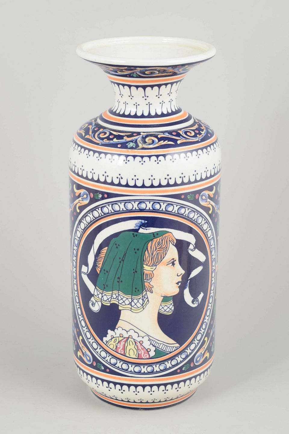 Dekorativ italiensk majolicavase udsmykket med decalcomania-overførselsteknik, hvor det farverige ornamentale motiv og portrætmedaljon er påført som transfertryk i klassisk majolica-stil.