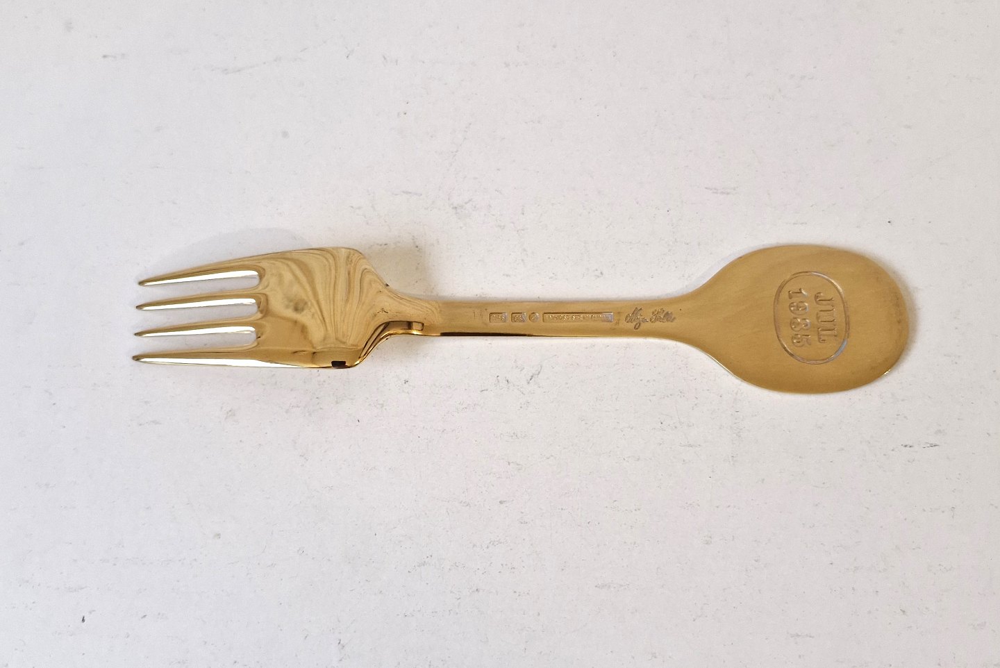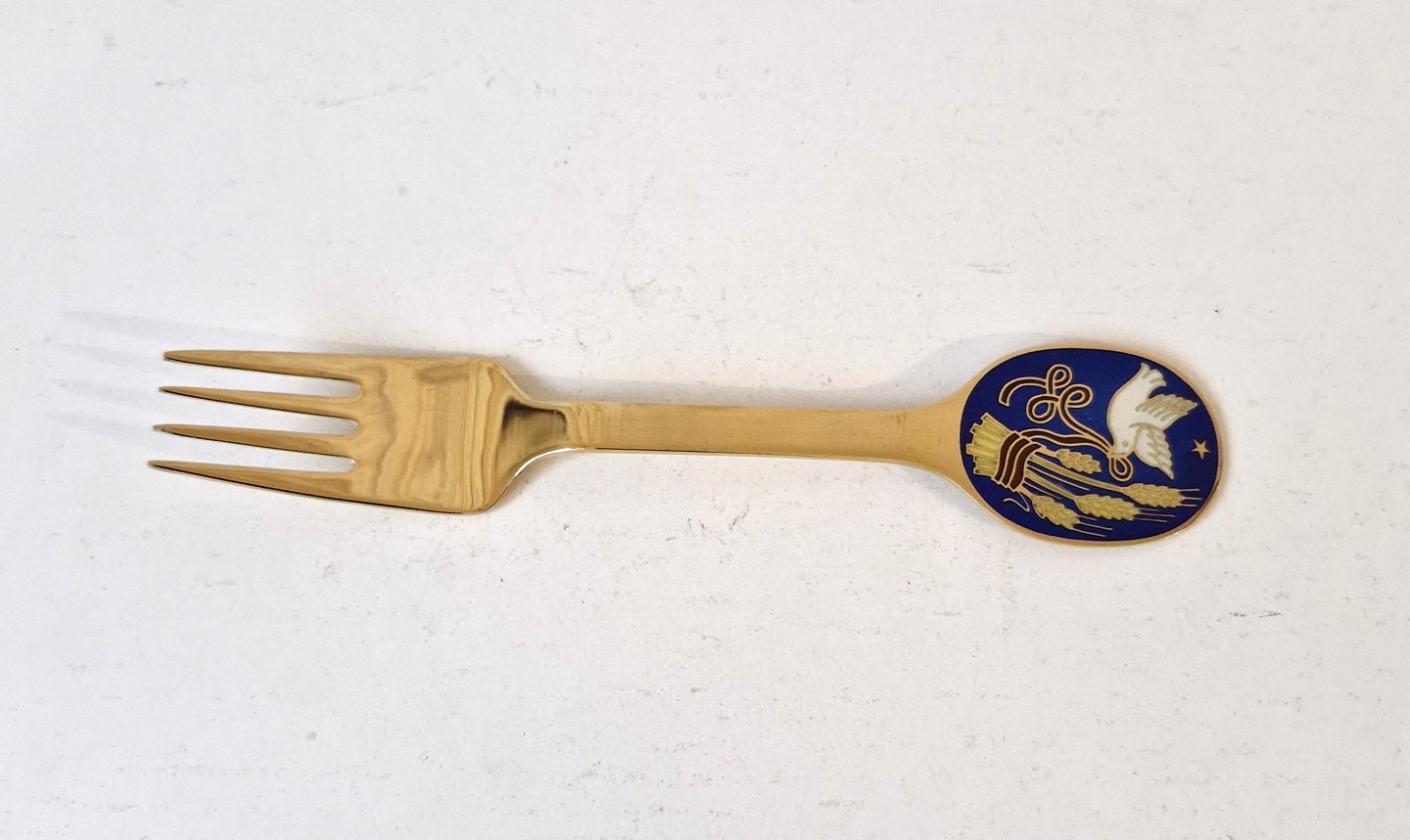 Text zugänglich auf Dänische: A.Michelsen julegaffel i forgyldt sterlingsølv og emalje fra 1985