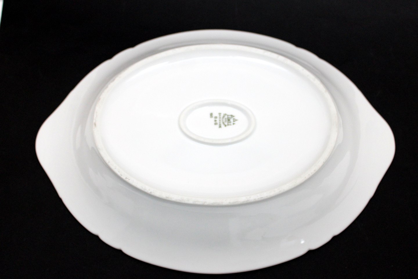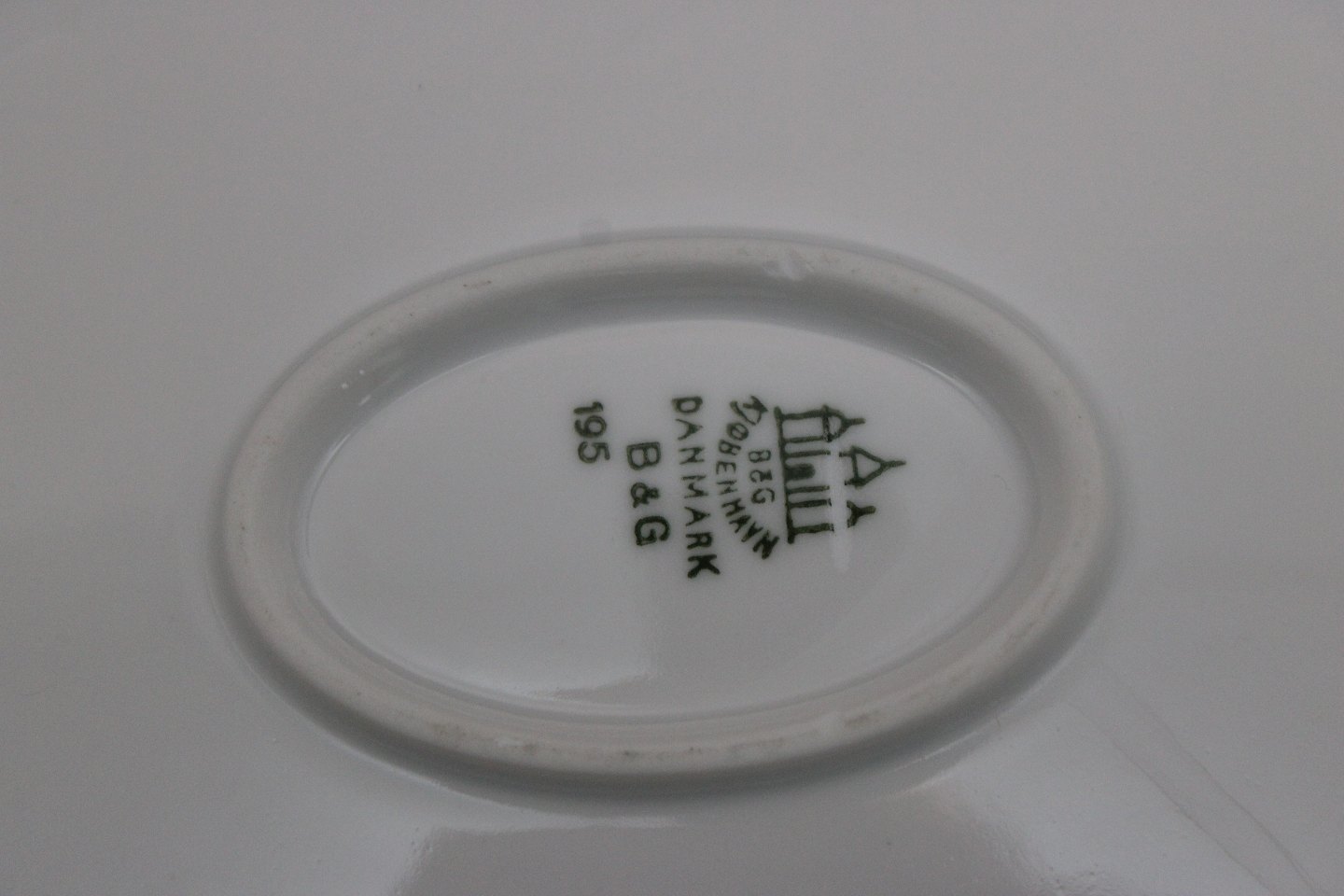 Text zugänglich auf Dänische: Bing & Grøndahl, Elegance, Stort ovalt brødfad meget sjælden og smukt. Nr. 195. Længde 34 cm. Bredde 24,5. Højde 5,5 cm. II. sortering. Enkelte overfladeridser efter brug. Pris: 975 kr.