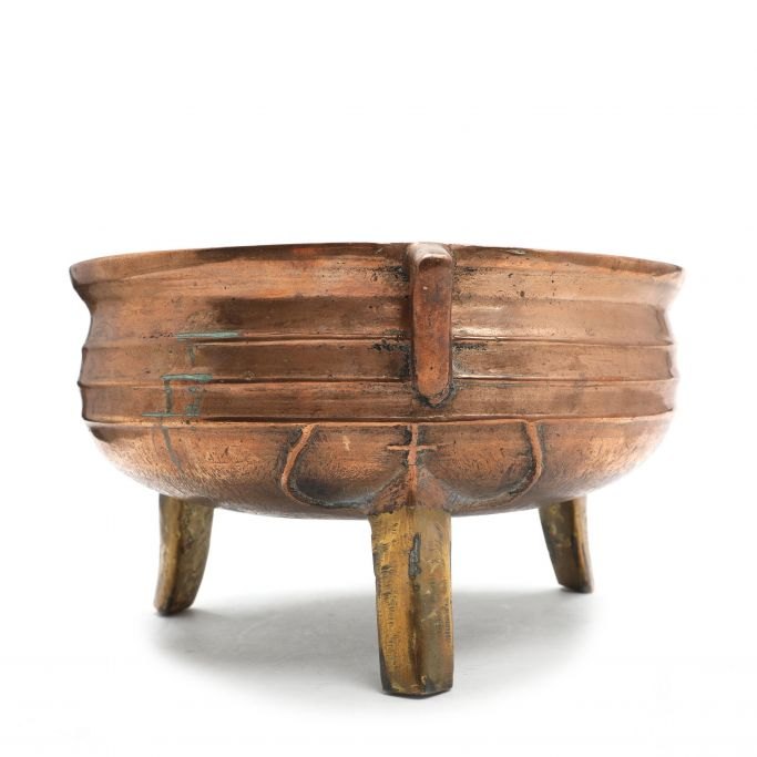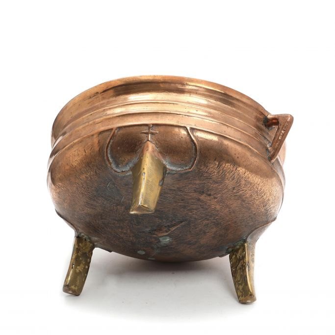 Dreibeiniger Erztopf aus der Renaissance, 15./16. Jahrhundert. Mit seitlichen Verzierungen, darunter Rippen. Repariert. Drei Beine aus Messing wurden später hinzugefügt. Der Topf wurde kürzlich poliert. Höhe: 18,5 cm. Durchmesser: 31,5 cm.