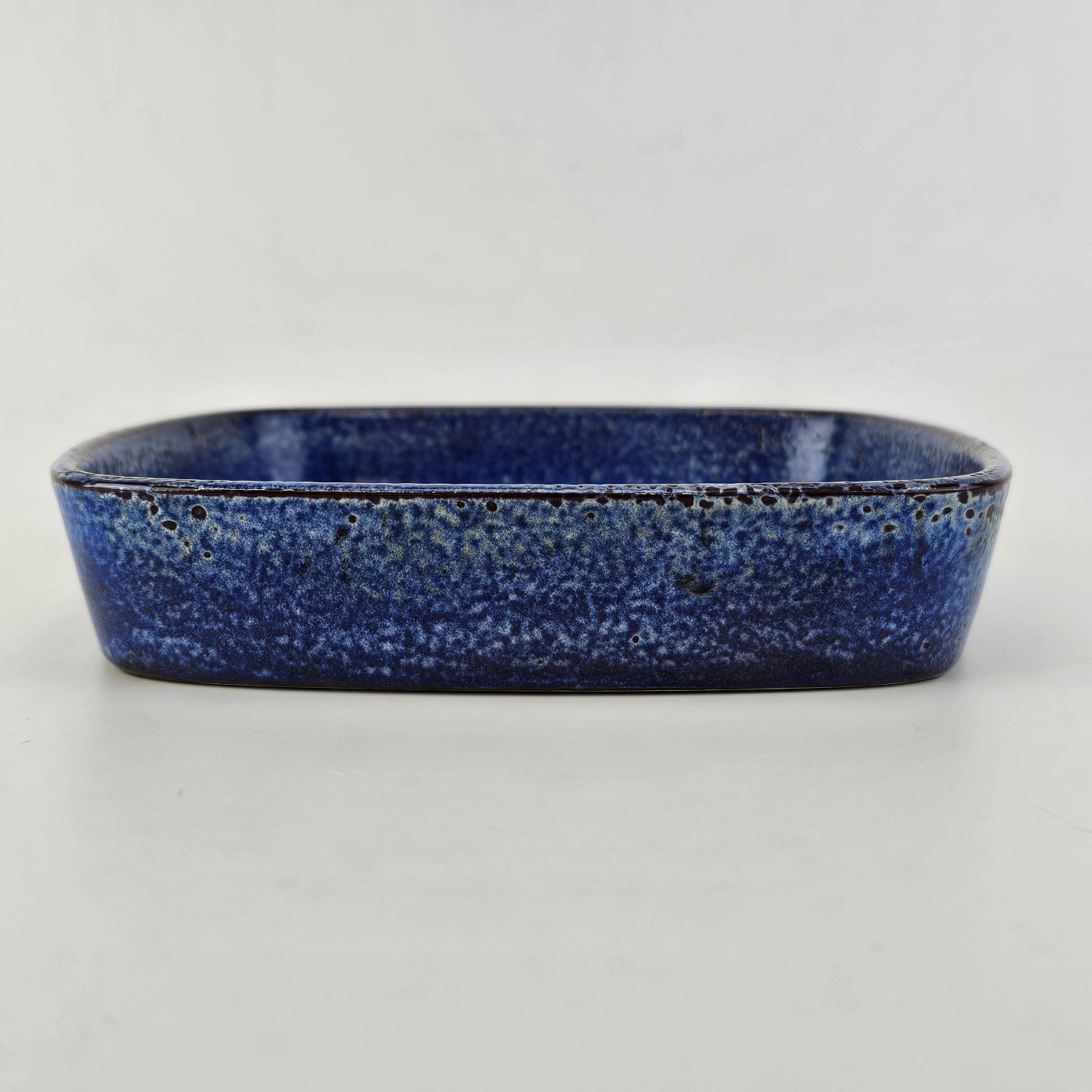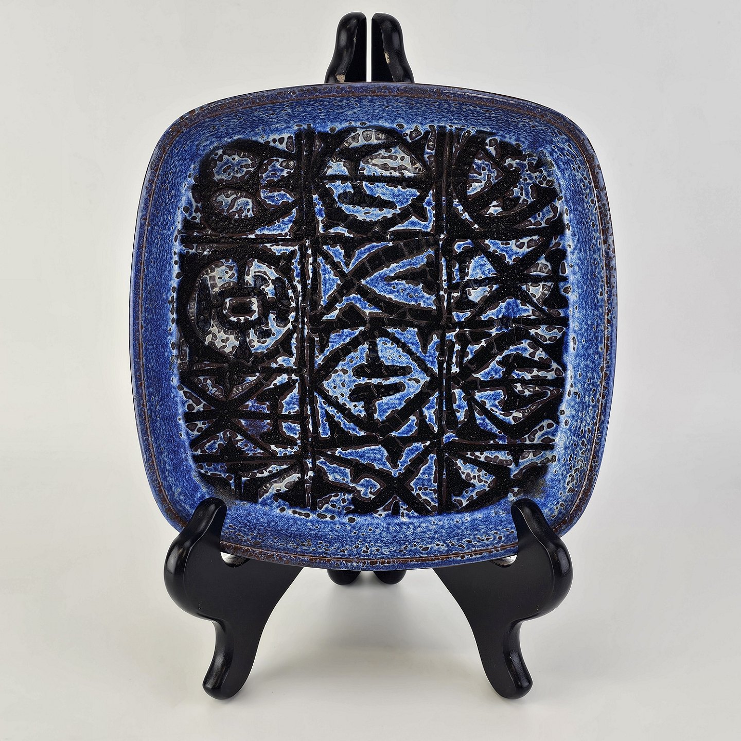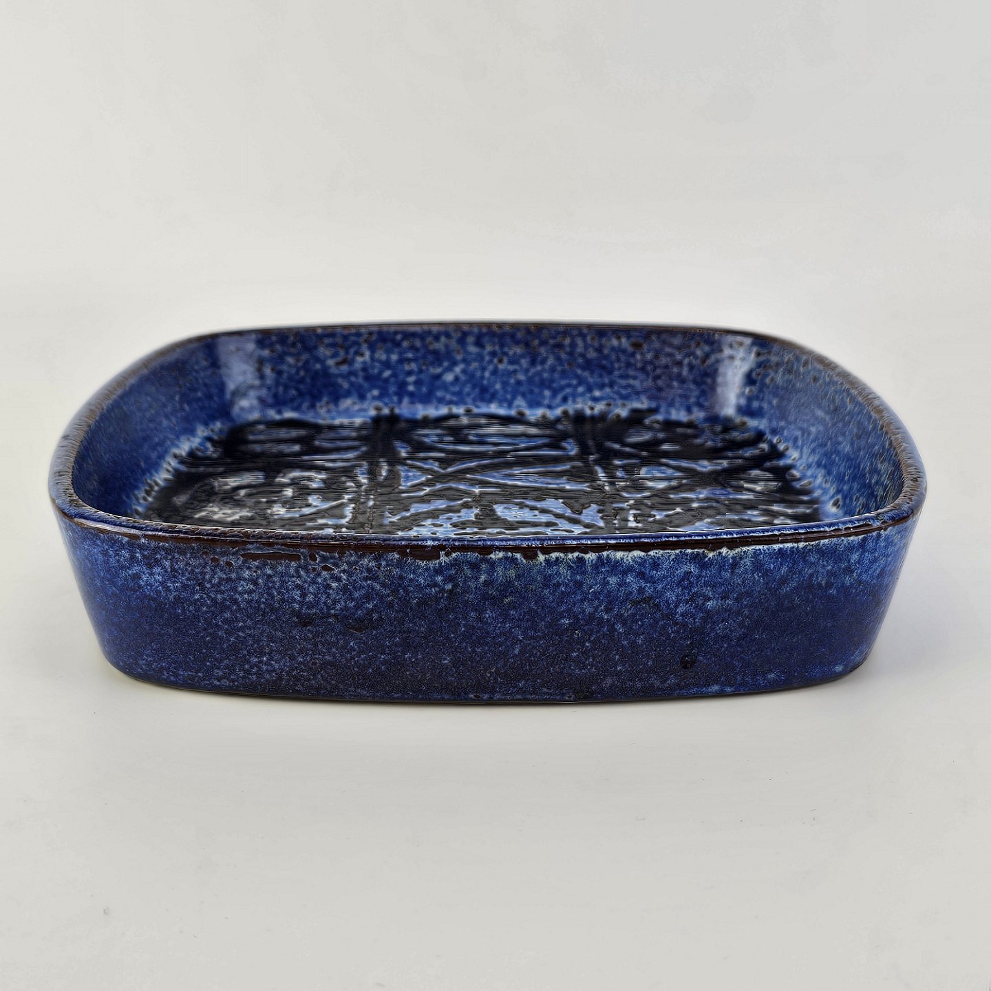 Firkantet bordfad i fajance fra Baca serien med mønster i blå og sort