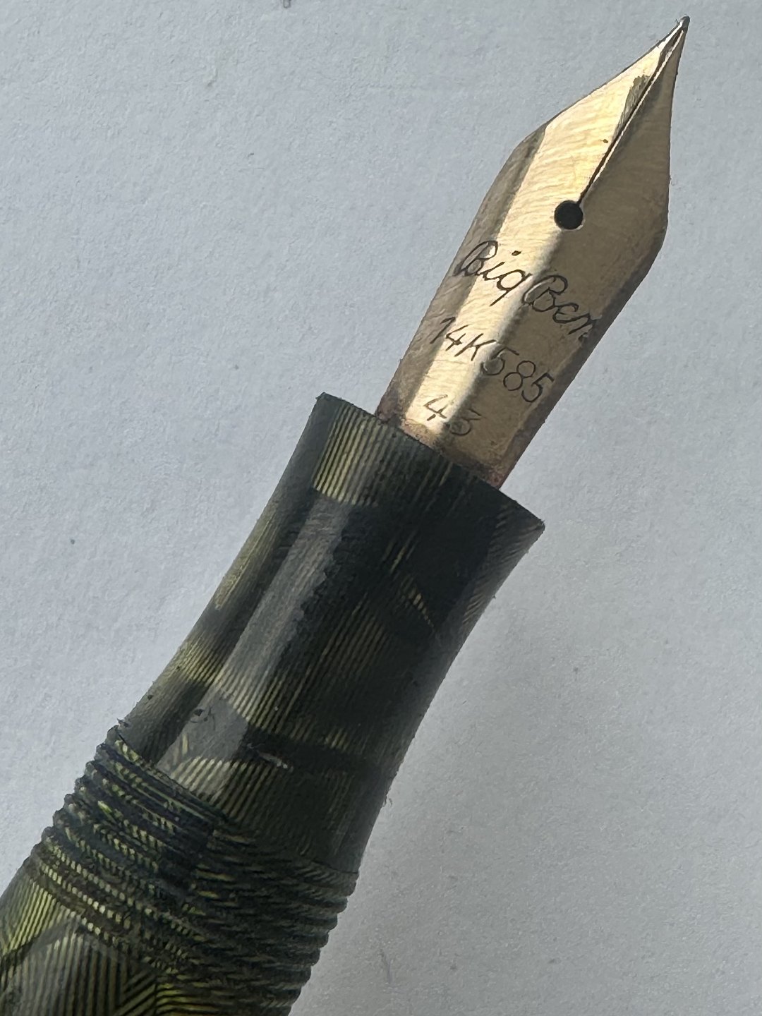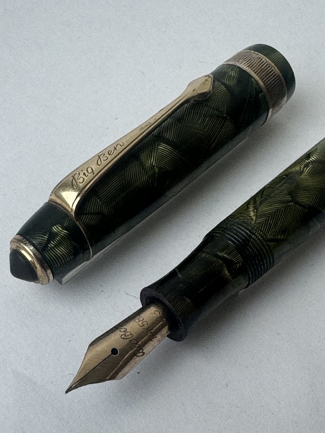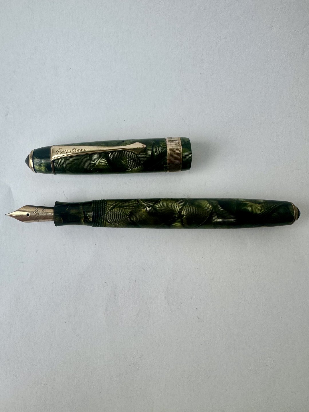 Stor grøn marmoreret Big Ben fyldepen Med bredt riflet mavebælte på hætten. Fremstår i god stand med alle dele originale Big Ben, inklusiv en 14 karat guldspids. Før end fyldepennen igen kan optage blæk og skrive, skal der indsættes ny gummisæk. Denne opgave kan udføres ved tillæg på kr. 200,- Længde: 13,6 cm