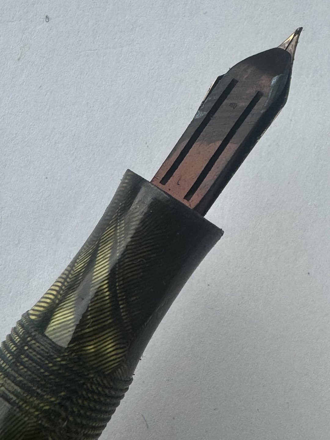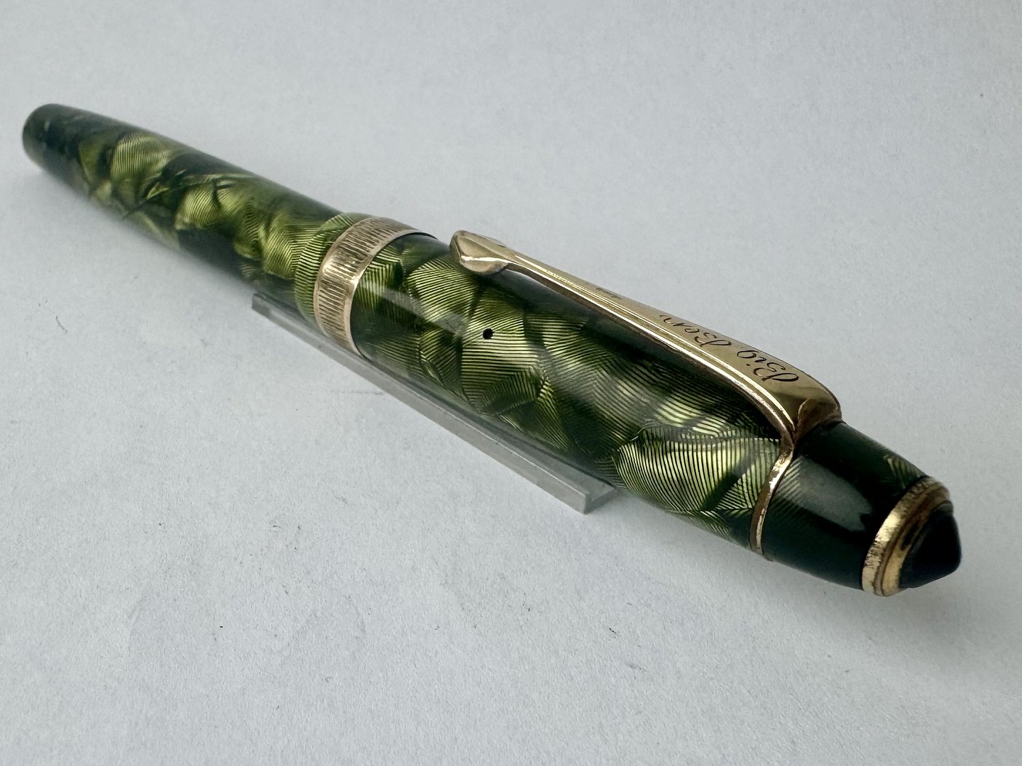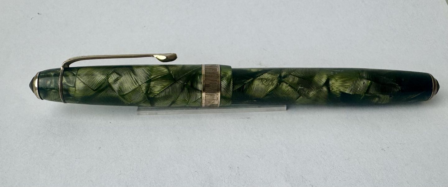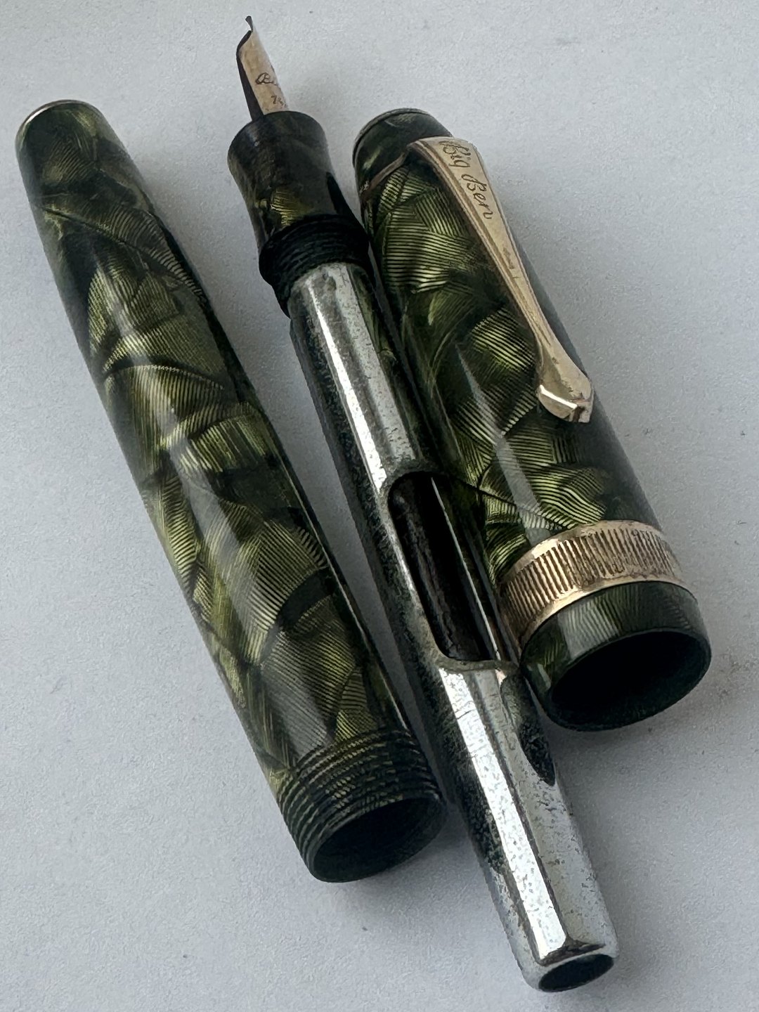 Stor grøn marmoreret Big Ben fyldepen Med bredt riflet mavebælte på hætten. Fremstår i god stand med alle dele originale Big Ben, inklusiv en 14 karat guldspids. Før end fyldepennen igen kan optage blæk og skrive, skal der indsættes ny gummisæk. Denne opgave kan udføres ved tillæg på kr. 200,- Længde: 13,6 cm