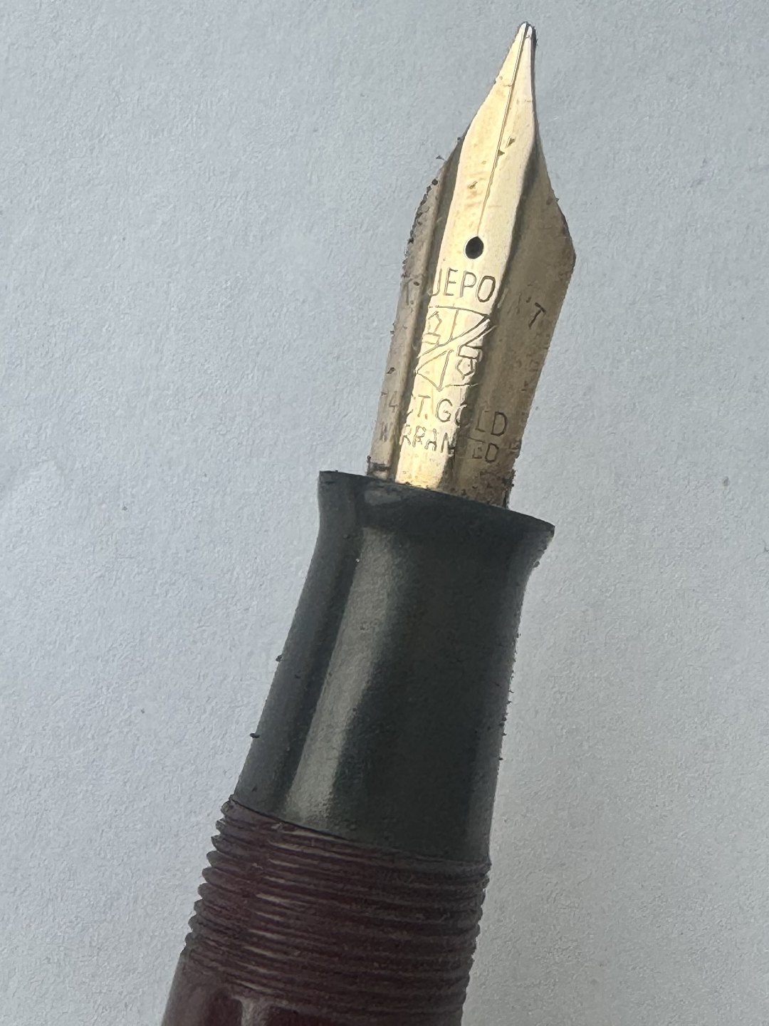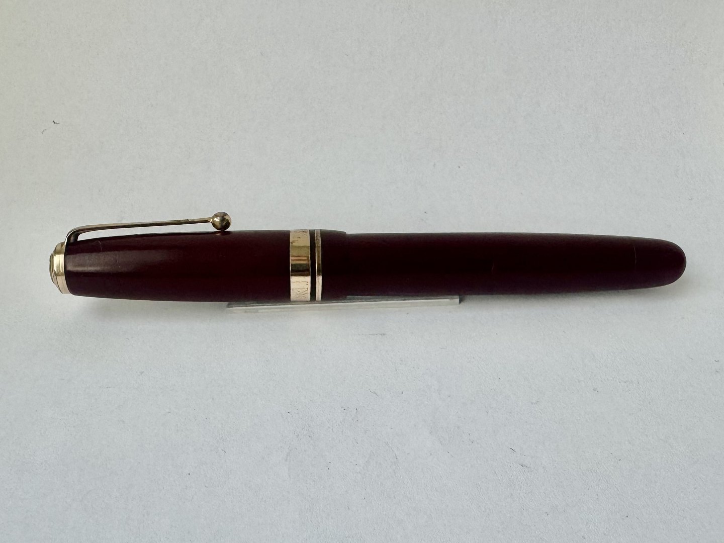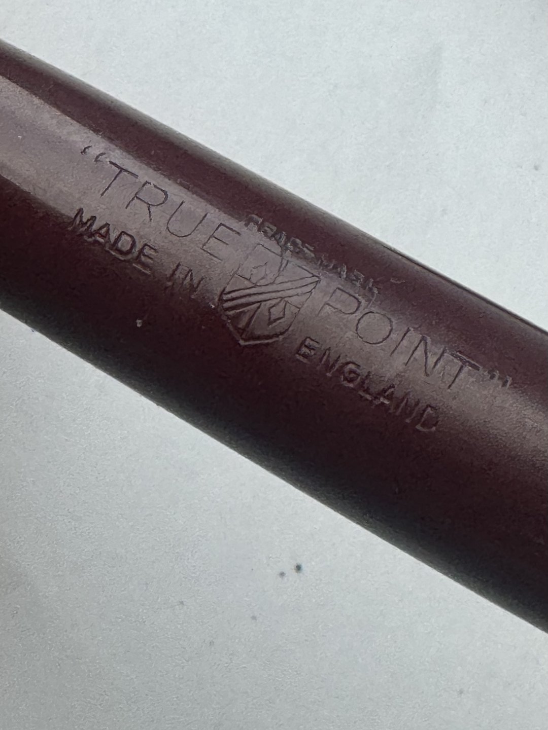 Kraftig Bordeaux “True Point” fountain pen. Push button filler. Fremstillet i England omkring 1950. Fremstår i god stand uden skader eller reparationer. Der skal indsættes en ny gummisæk før end fyldepennen igen skal optage blæk og skrive igen. Dette koster ekstra kr. 200, at få udført. Længde: 13,4 cm