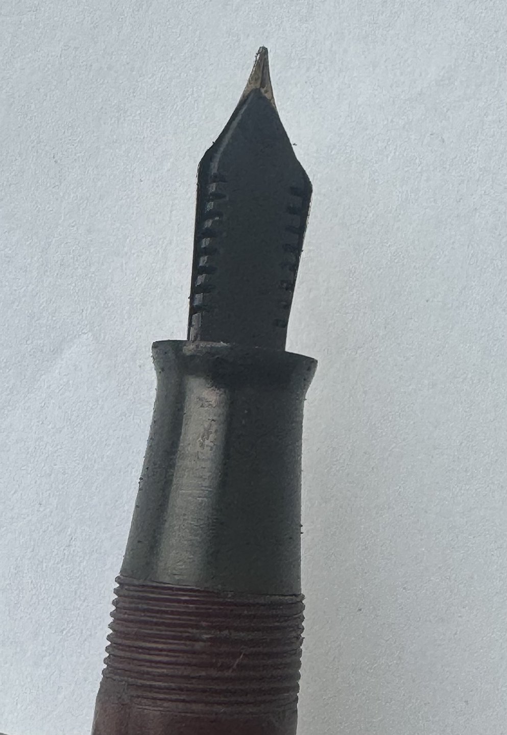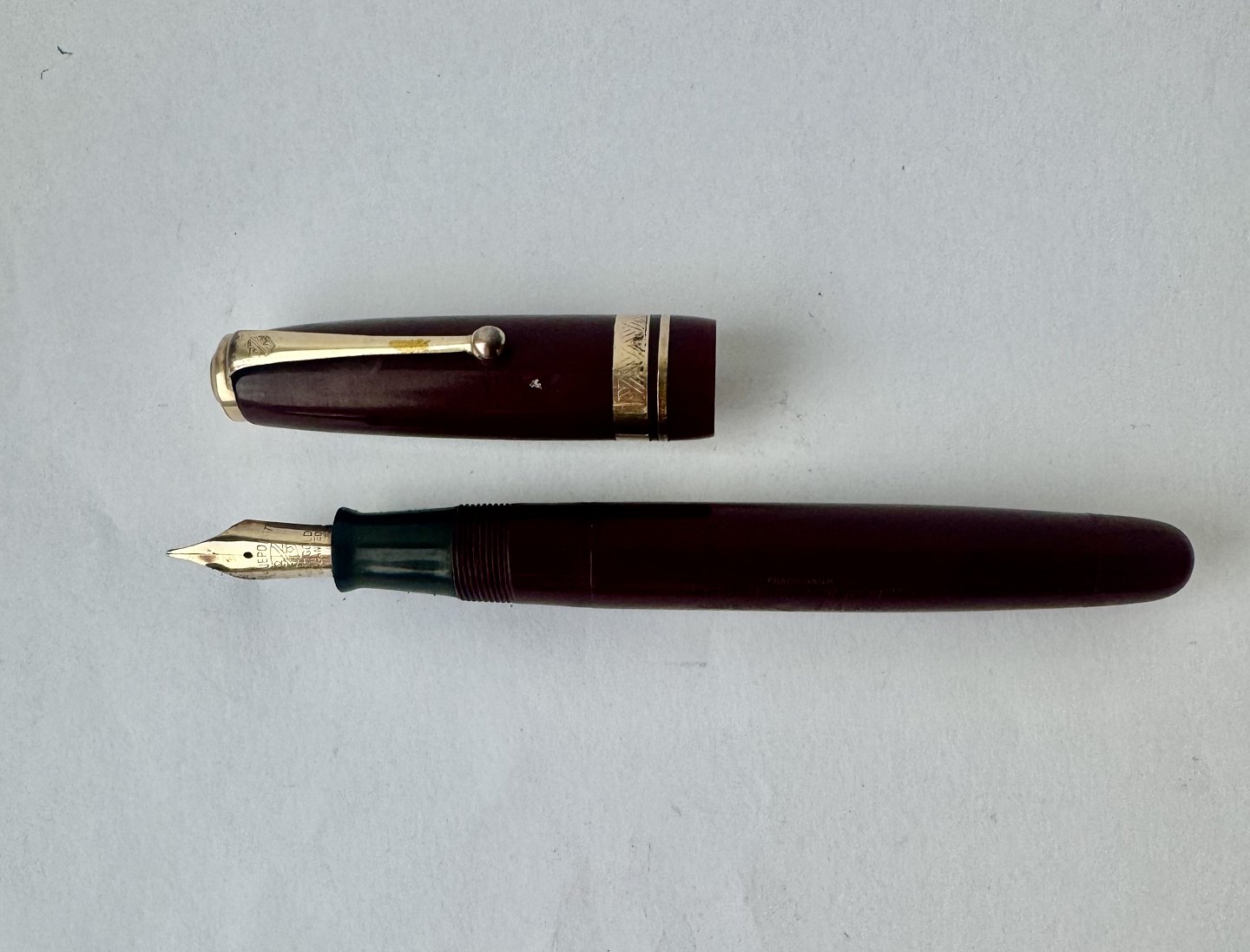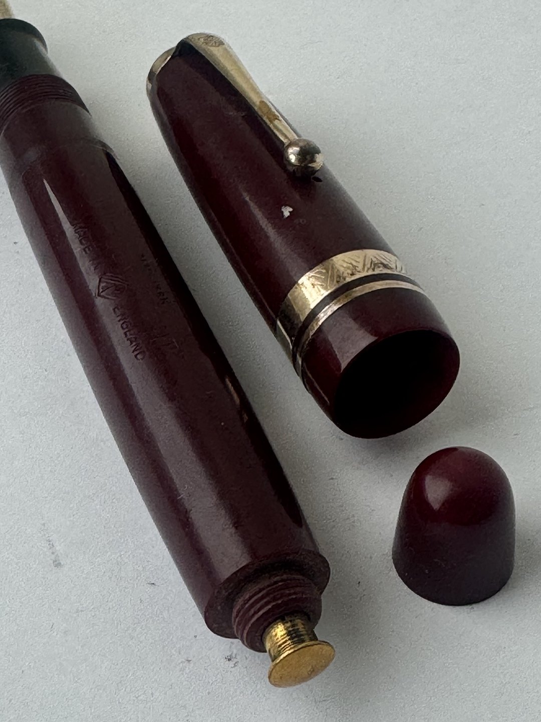 Kraftig Bordeaux “True Point” fountain pen. Push button filler. Fremstillet i England omkring 1950. Fremstår i god stand uden skader eller reparationer. Der skal indsættes en ny gummisæk før end fyldepennen igen skal optage blæk og skrive igen. Dette koster ekstra kr. 200, at få udført. Længde: 13,4 cm