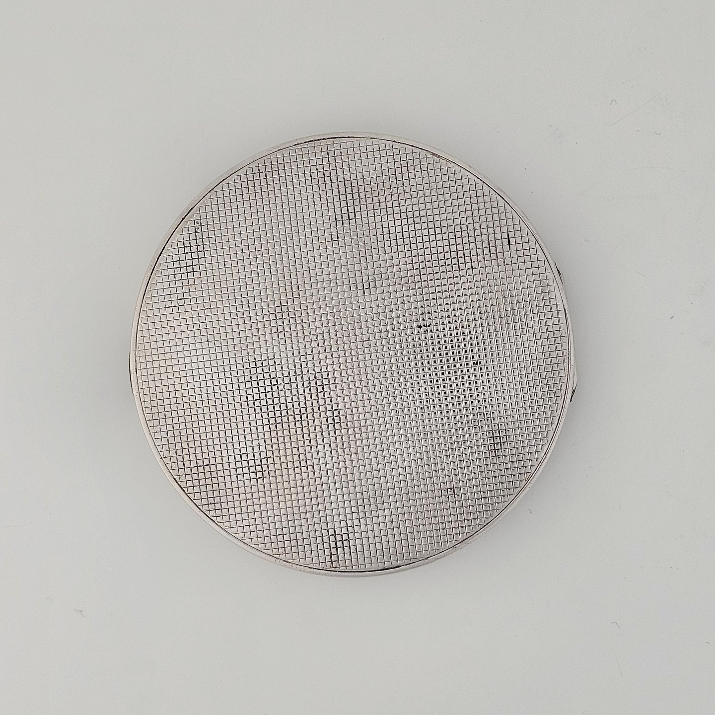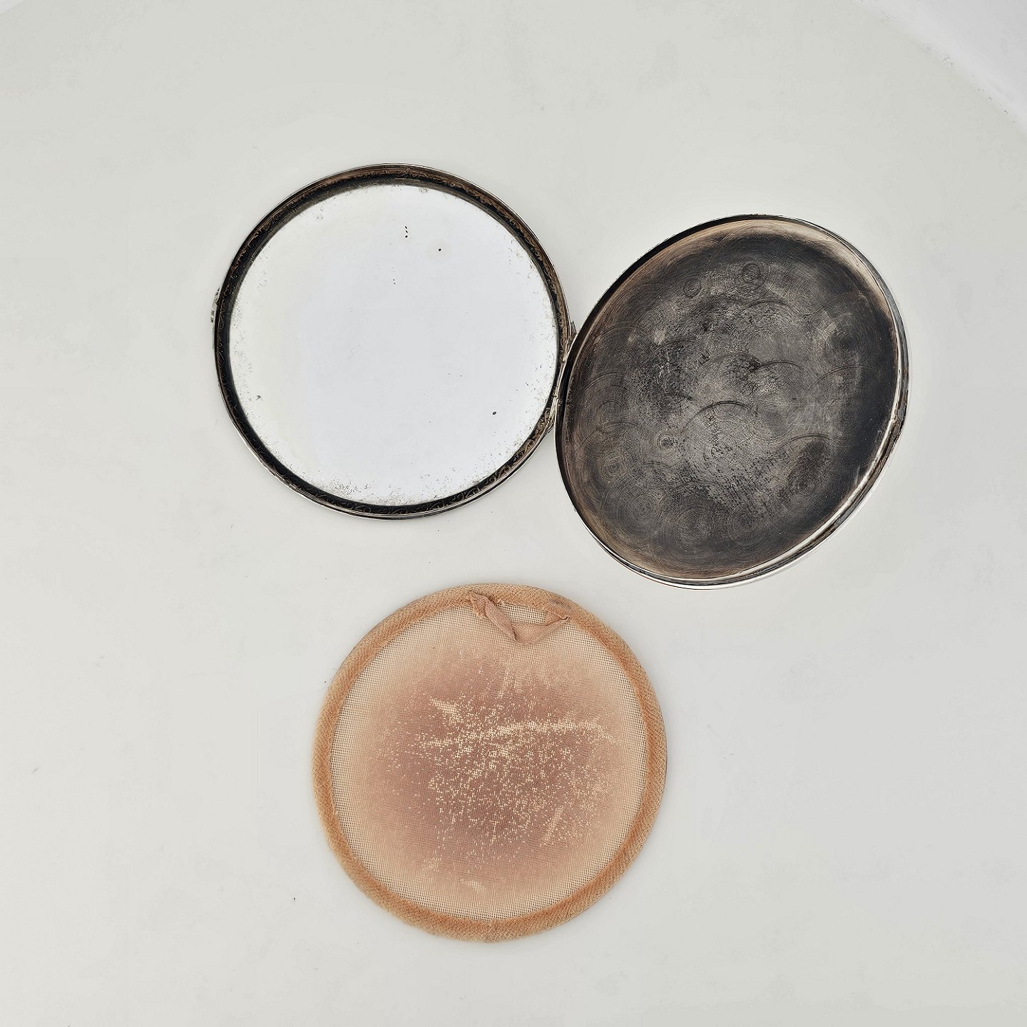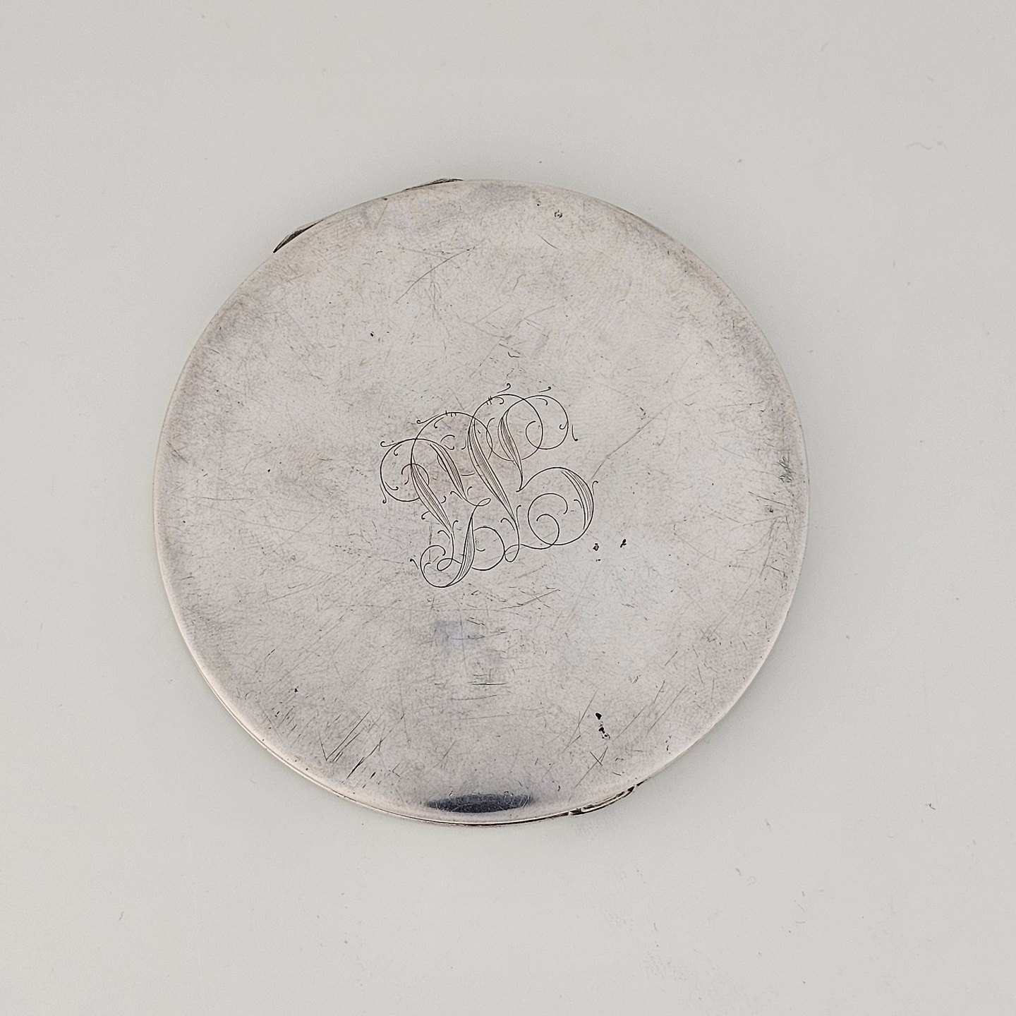 Rund pudderdåse med spejl i sterling sølv med monogram på bunden