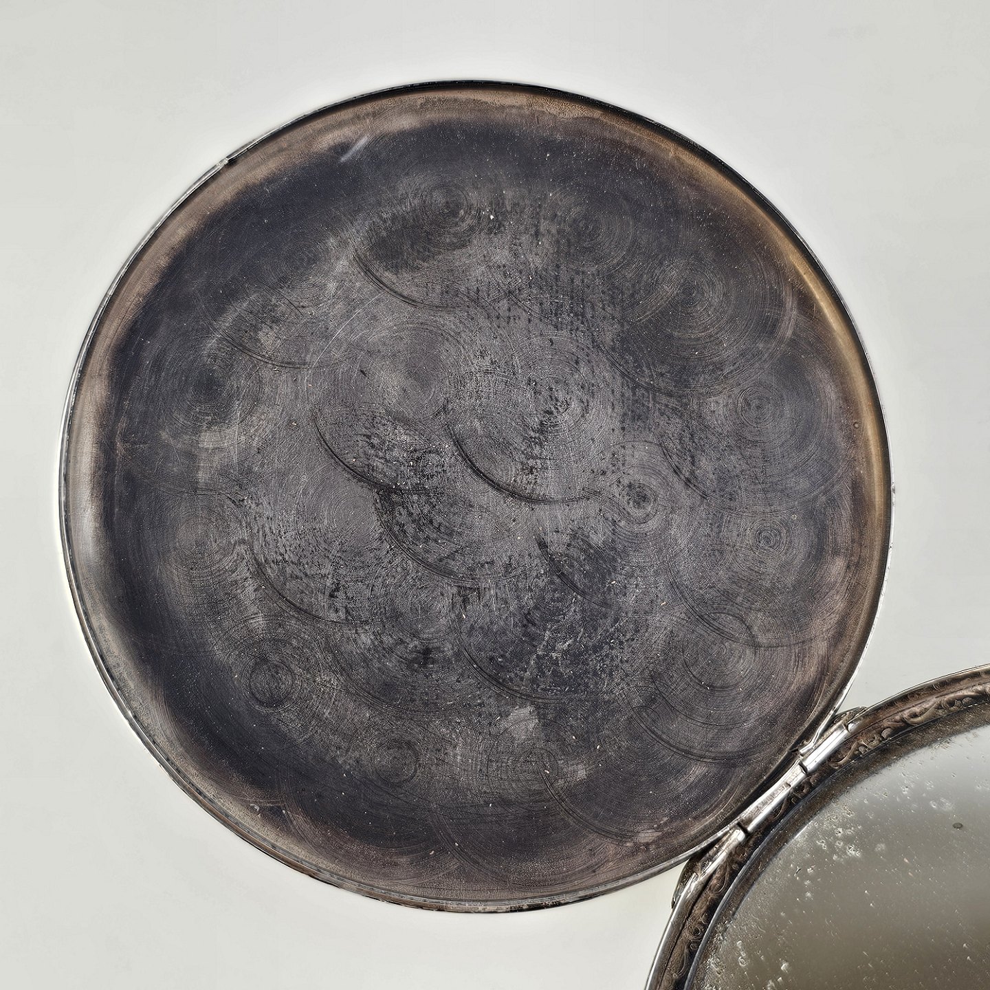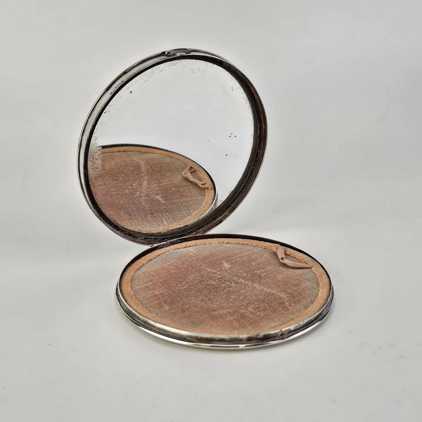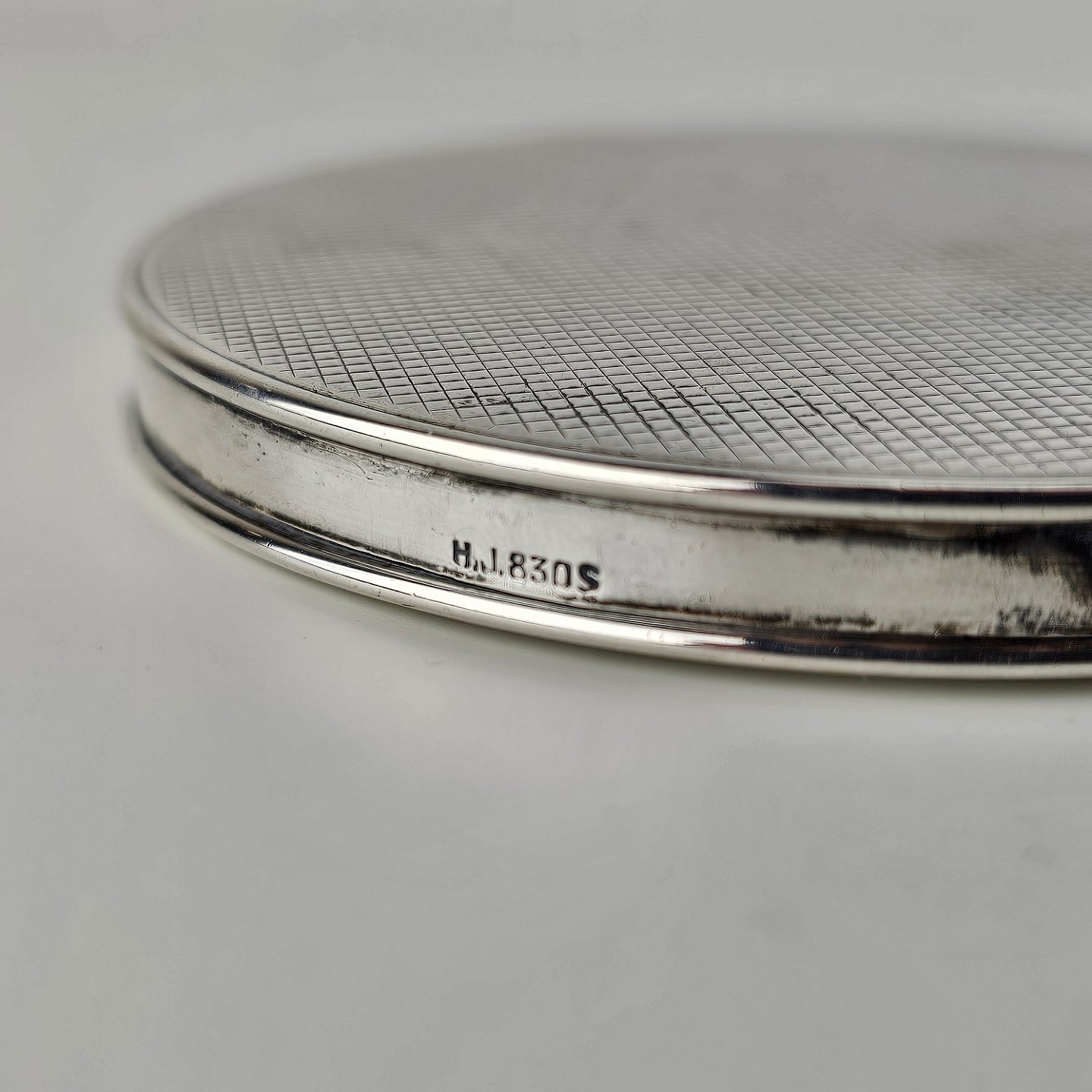 Rund pudderdåse med spejl i sterling sølv med monogram på bunden