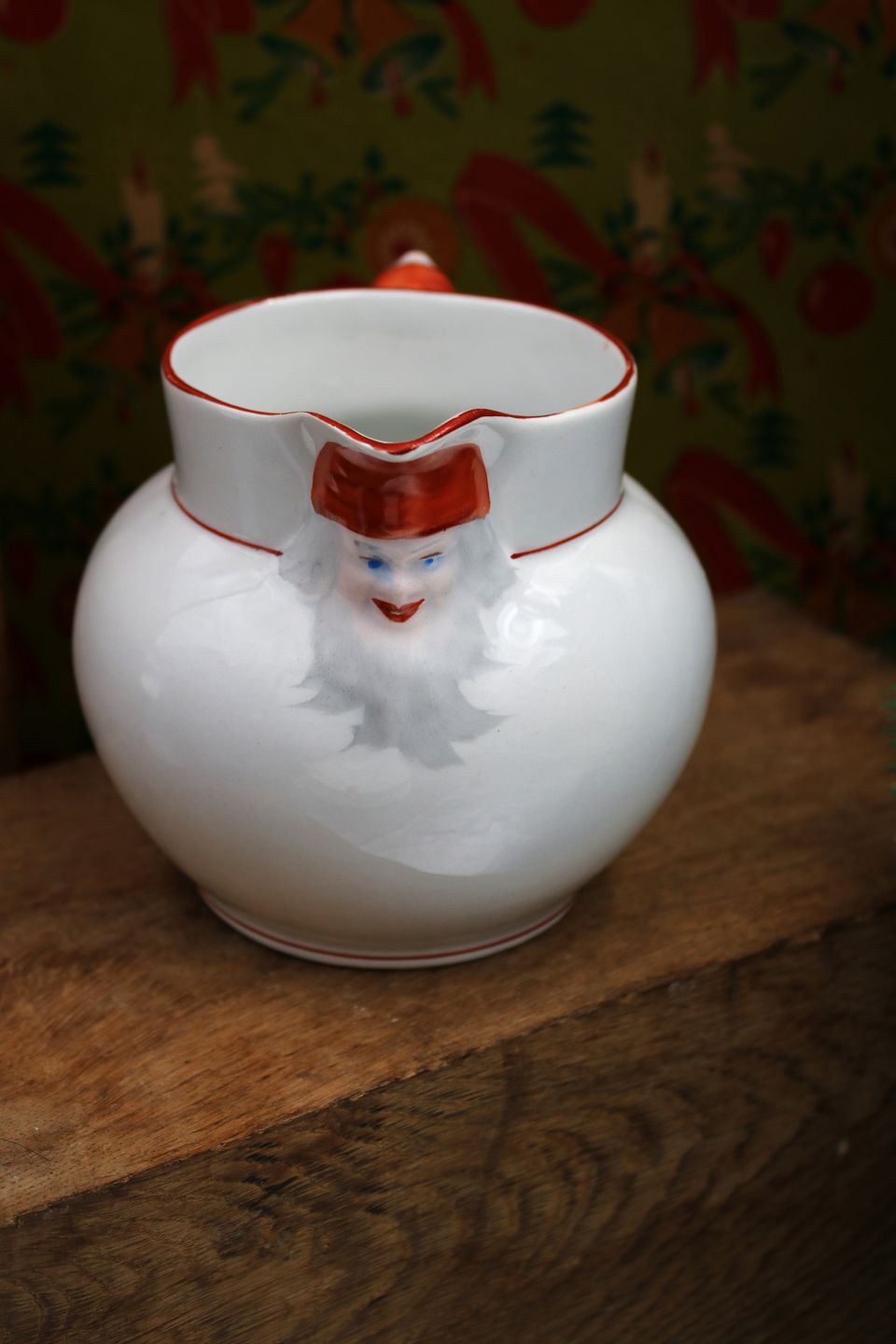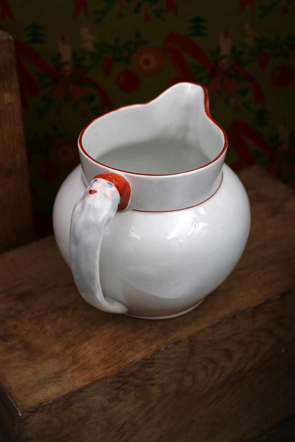Gammel svensk julekande i fajance med nisser på hældetuden og på hanken...
