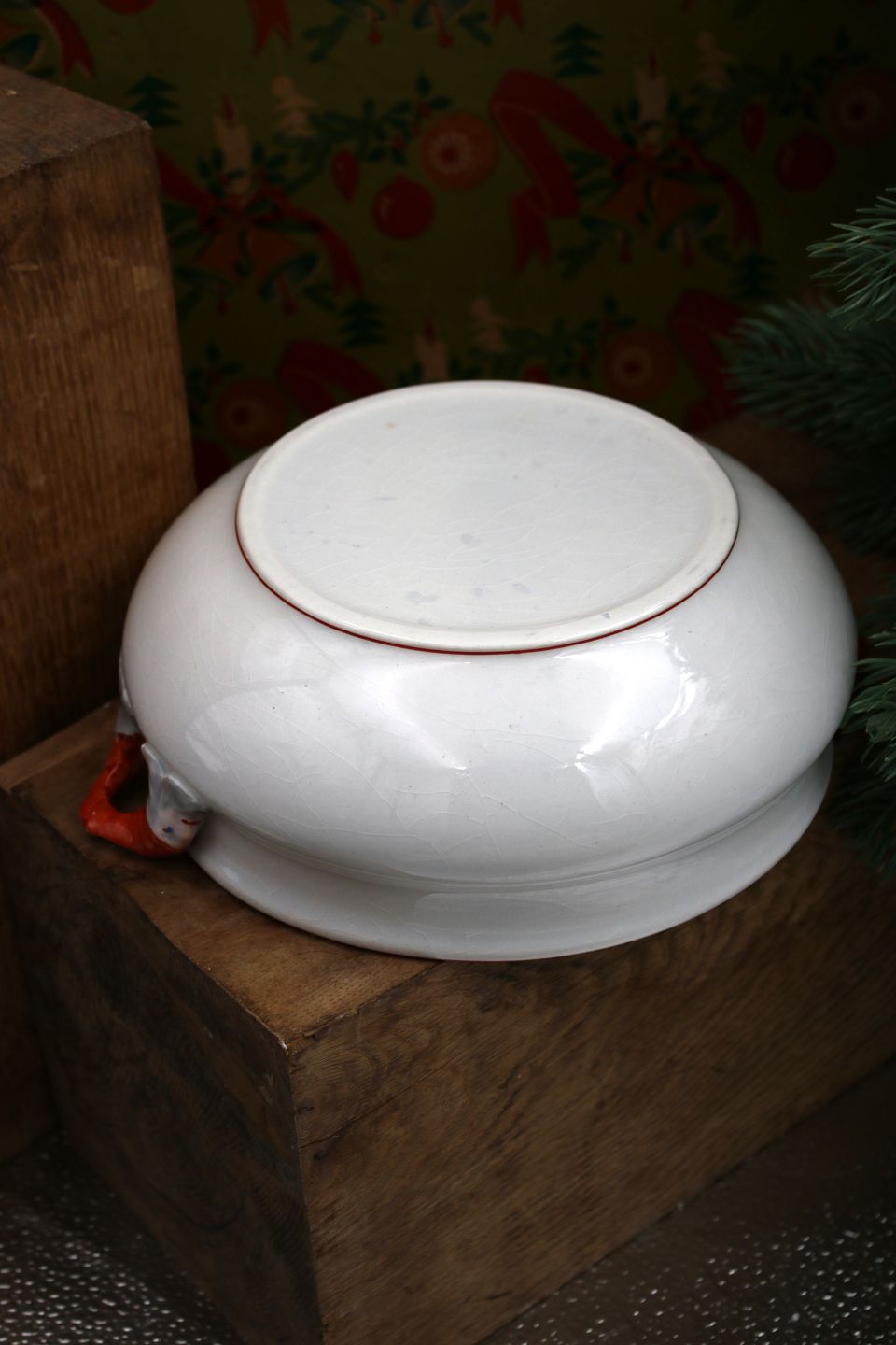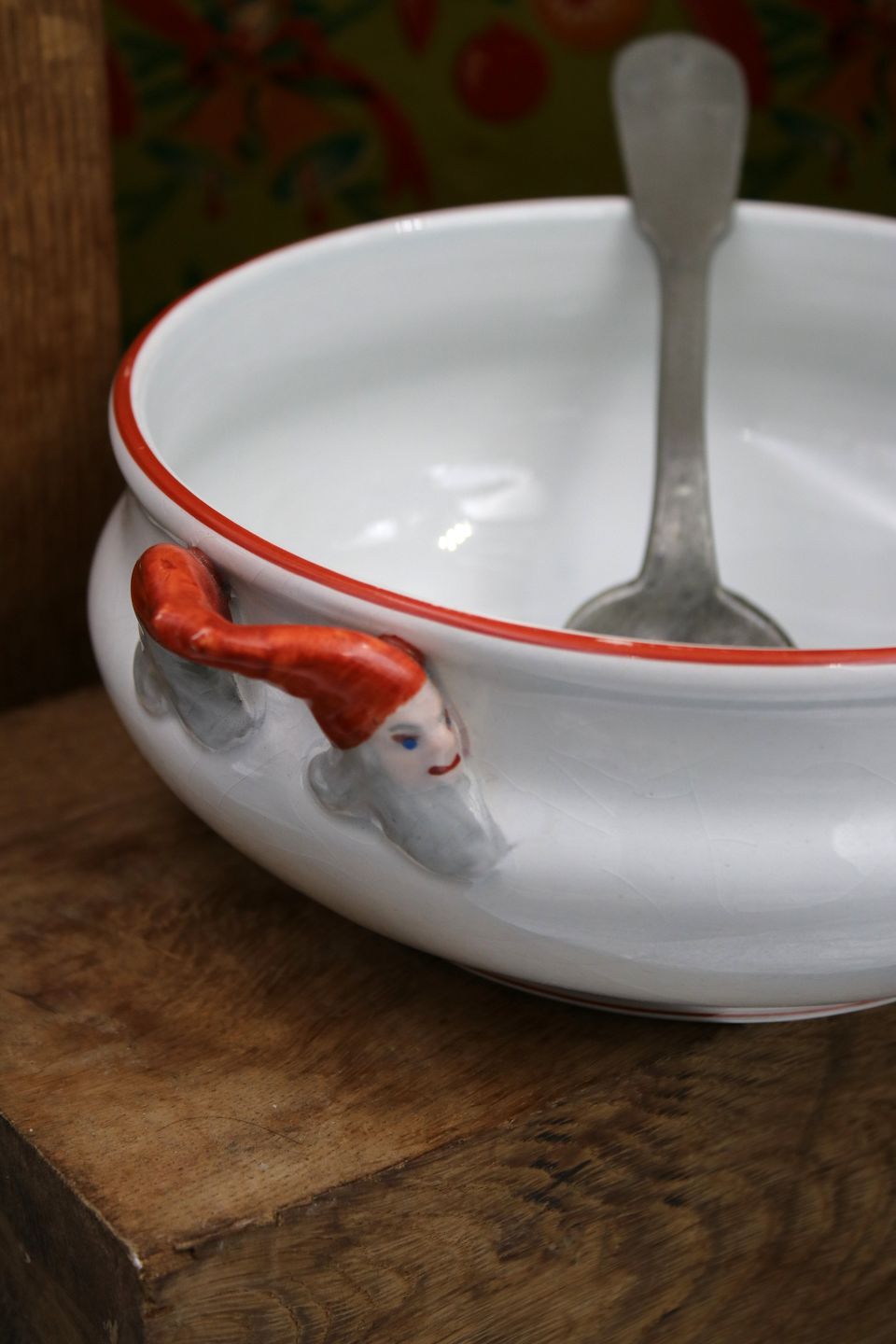 Gammel svensk juleskål i fajance med nisse på hankene.