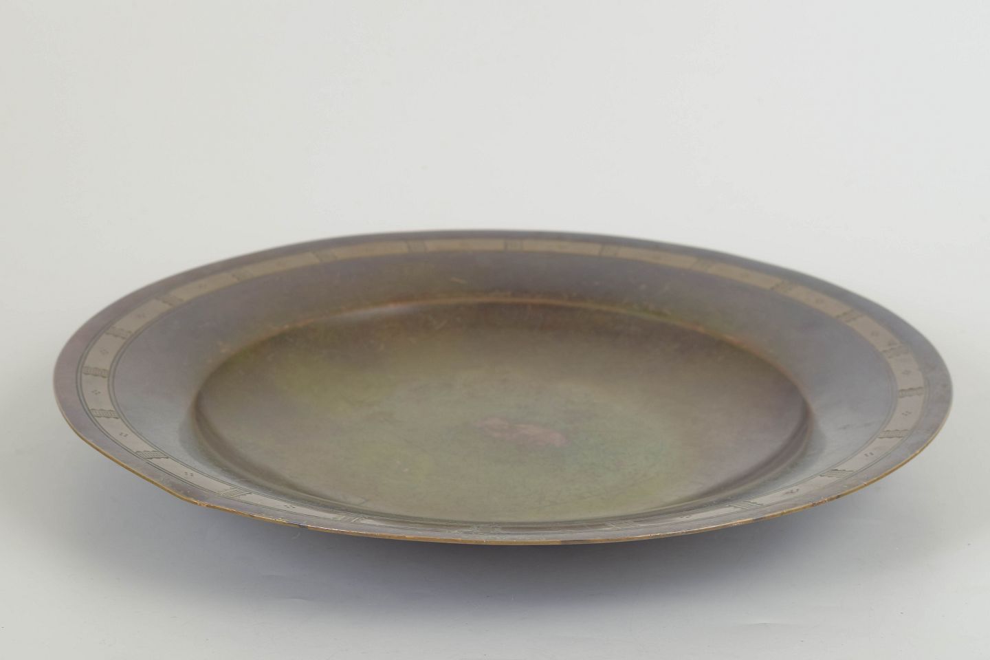 Stort rundt art deco fad med bred kant dekoreret med indlagte geometriske bånd. Den varme grønbrune patina og de stramme linjer er karakteristiske for Just Andersens formsprog og hans arbejde med egne legeringer.