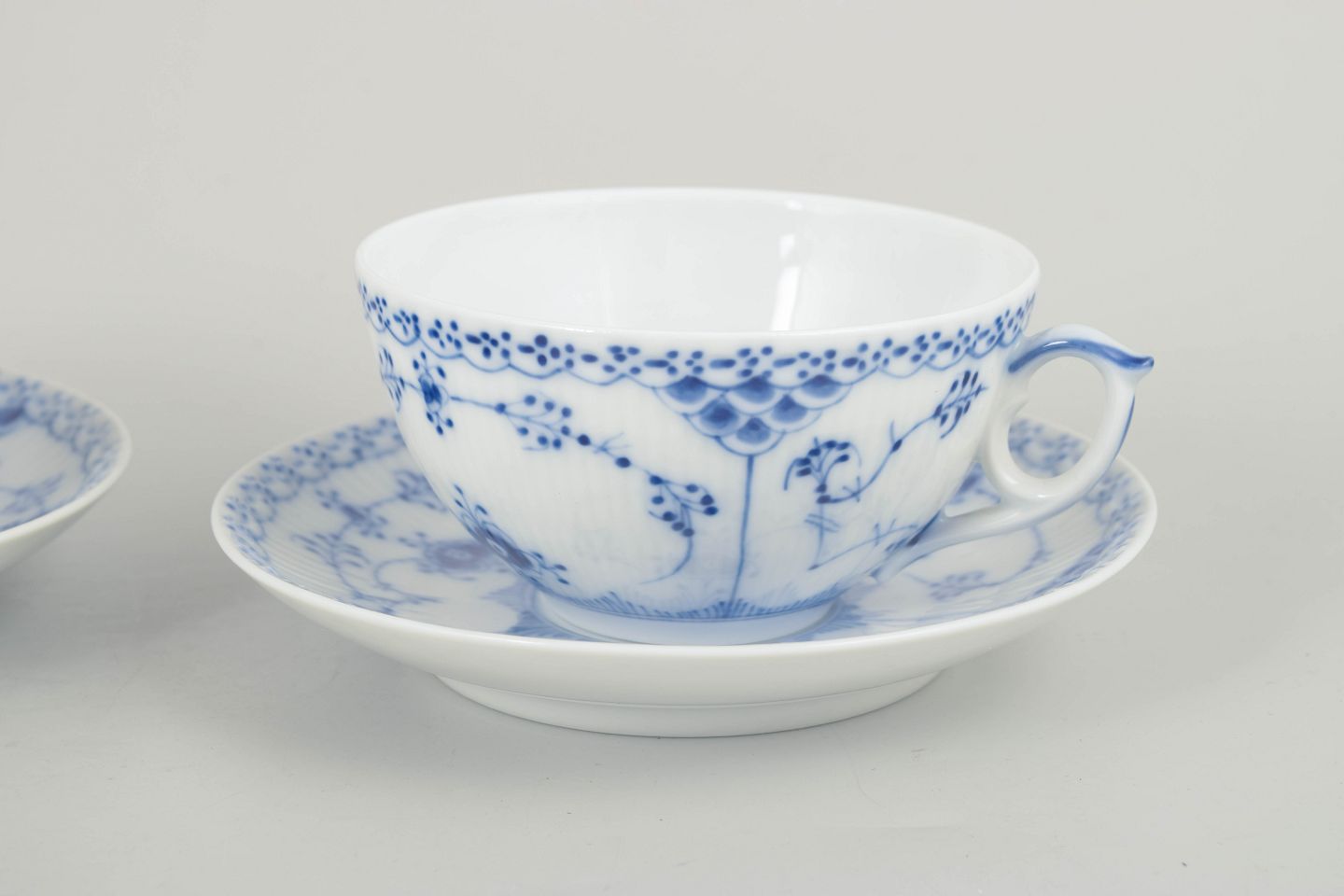 Tekopper i halvblonde, håndmalet porcelæn. De klassiske blå dekorationer og den rummelige tekopform gør modellen til en populær del af stellet. Én kop i tredje sortering, mens de øvrige dele er 1. sortering.