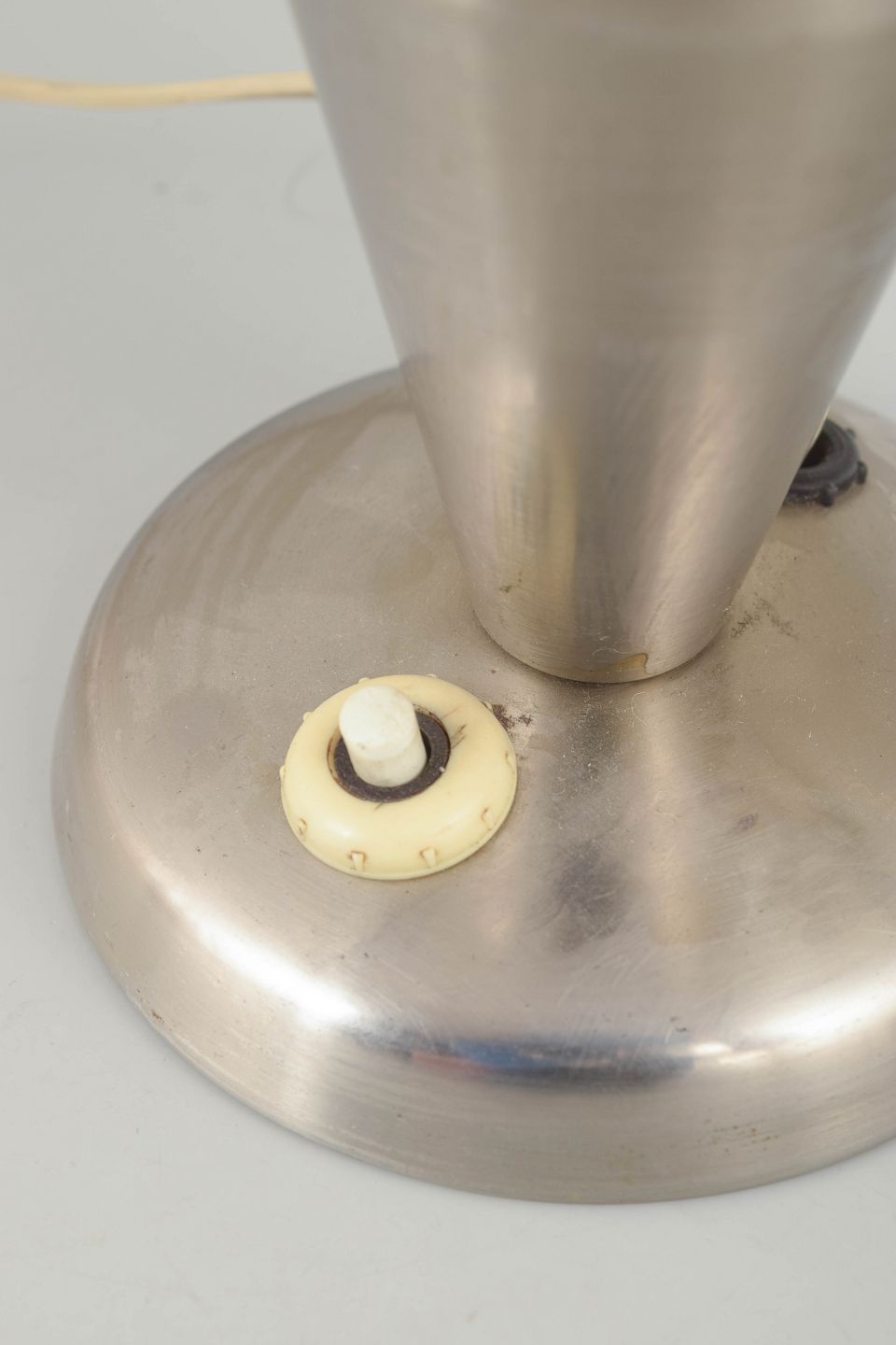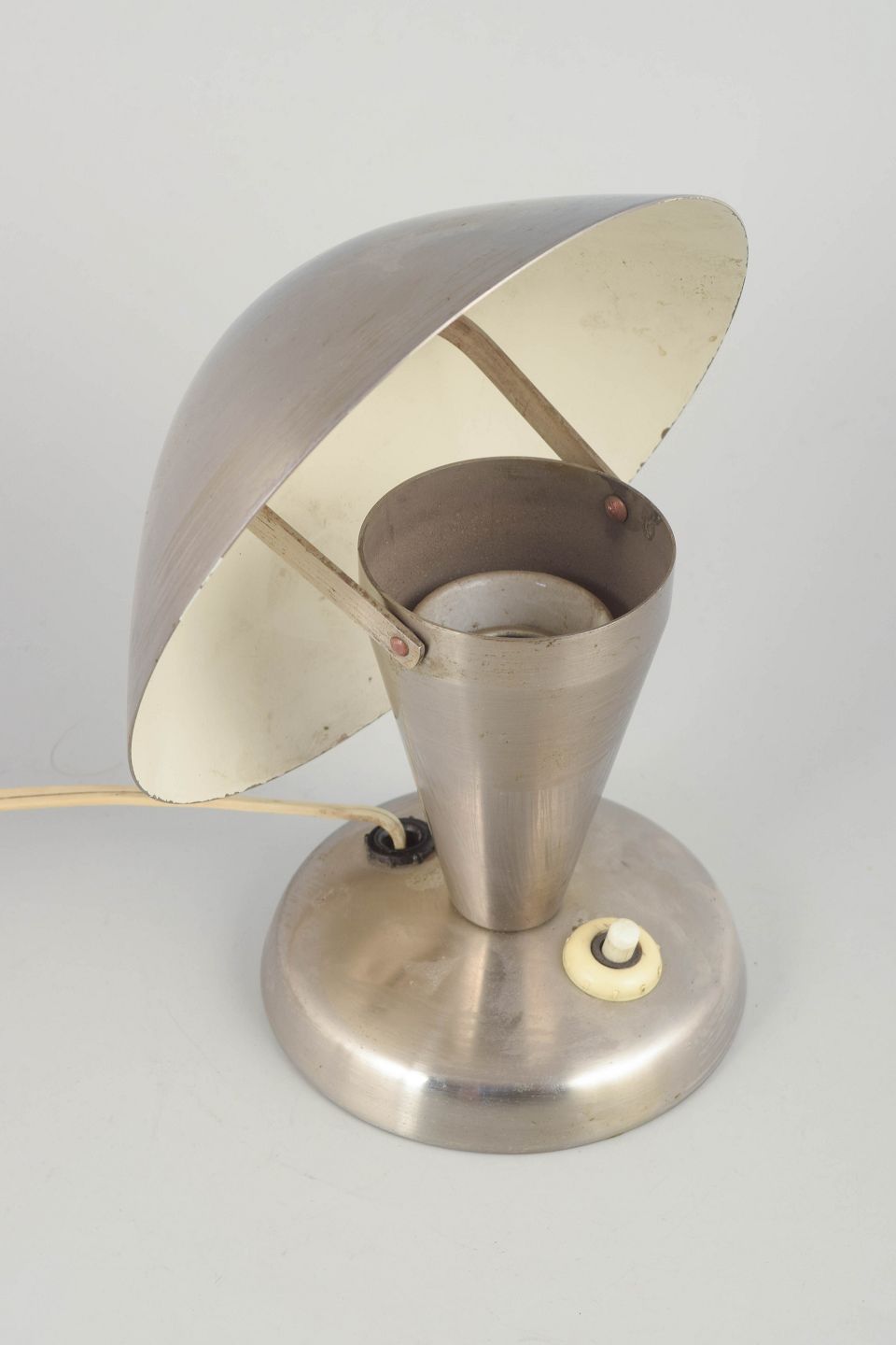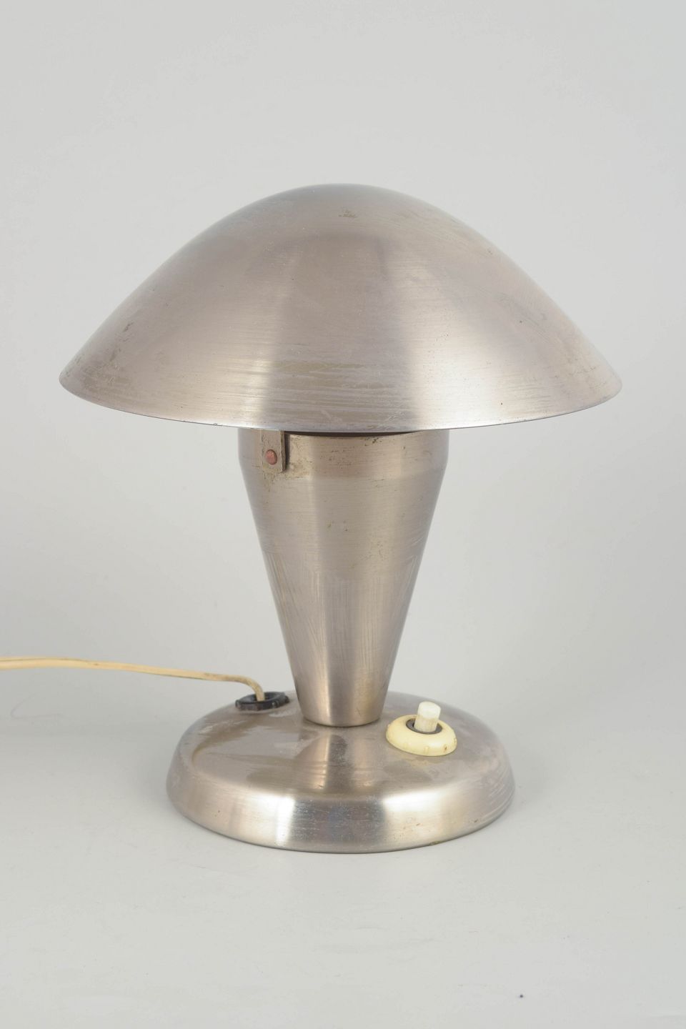 Tidlig modernistisk bordlampe i børstet stål med svampeformet skærm og konisk fod. Et karakteristisk eksempel på tjekkisk funktionalistisk belysningsdesign fra mellemkrigstiden, hvor rene linjer og industrielle materialer dominerede.