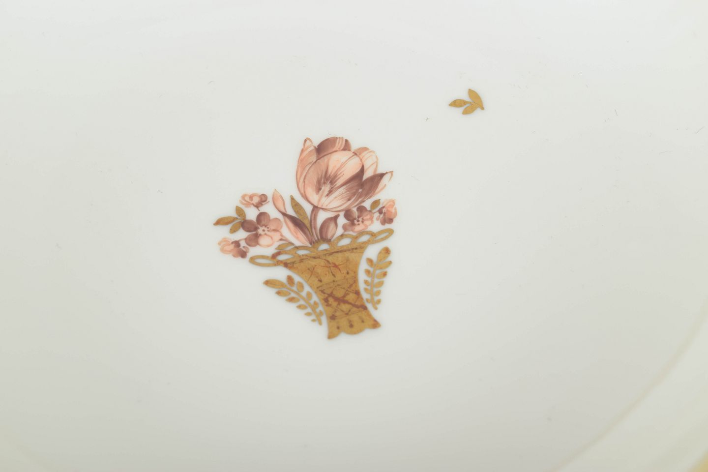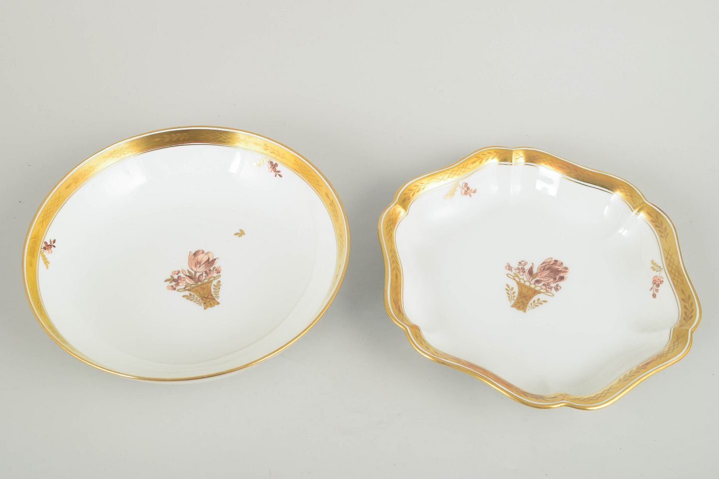 To elegante skåle i porcelæn fra Royal Copenhagens “Guldkurv”-serie, modeller 595/9024 og 595/9458. Begge med forgyldt kant og håndmalet blomsterkurvmotiv. Den ene skål har rund form, den anden en blødt bølget kant.