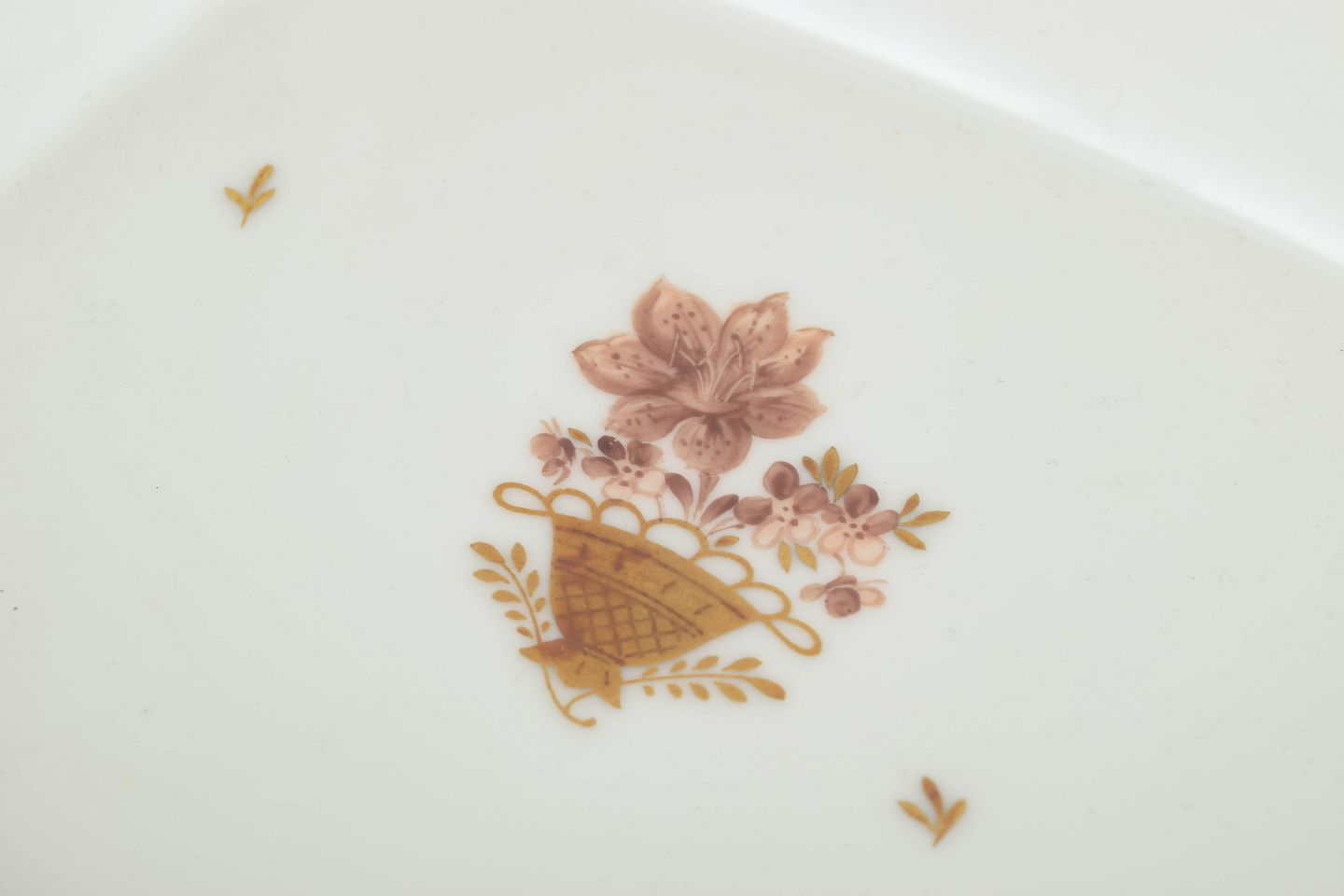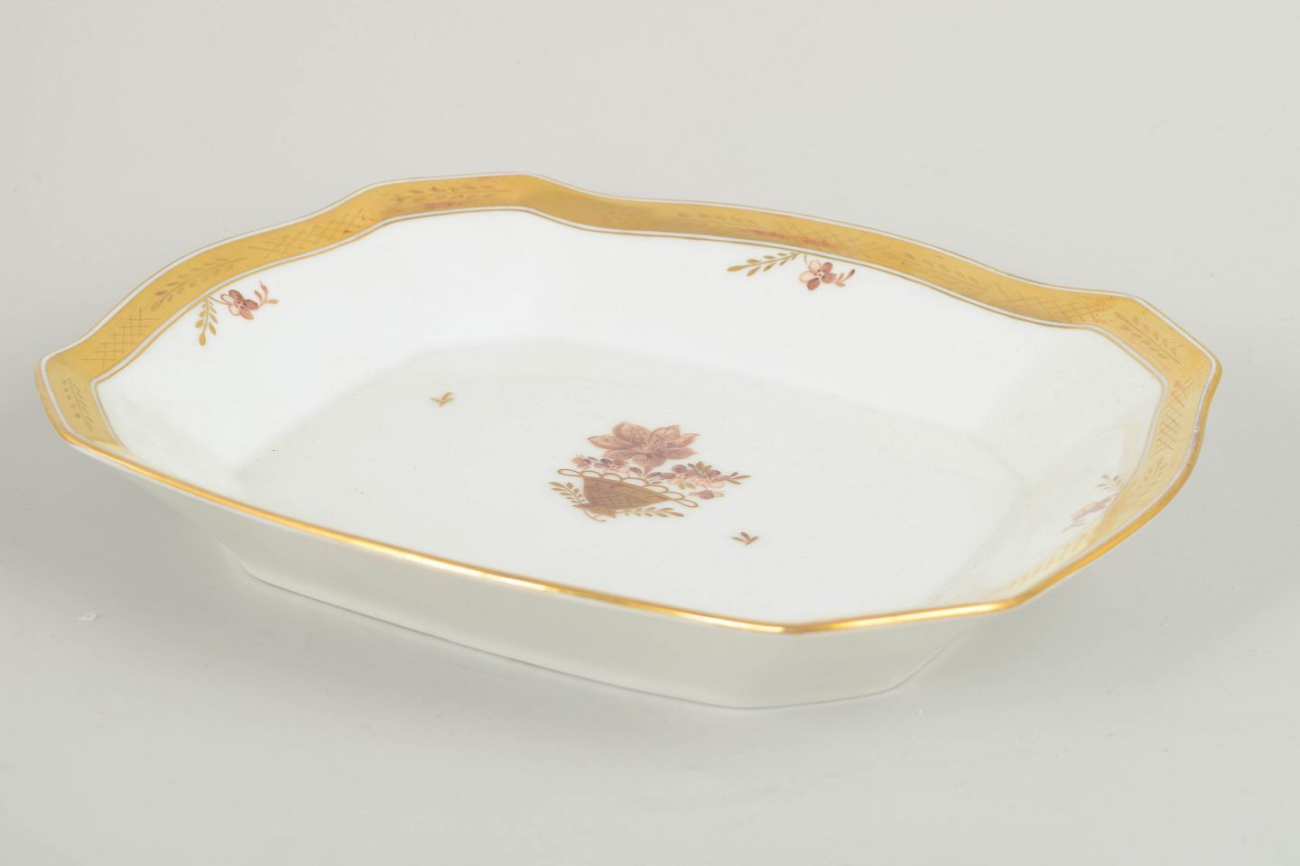 Flot ottekantet kagefad i porcelæn fra Royal Copenhagens “Guldkurv”-serie, model 595/9047. Udført med bred forgyldt kant og håndmalet blomsterkurvmotiv i centrum samt dekorative blomsterranker.