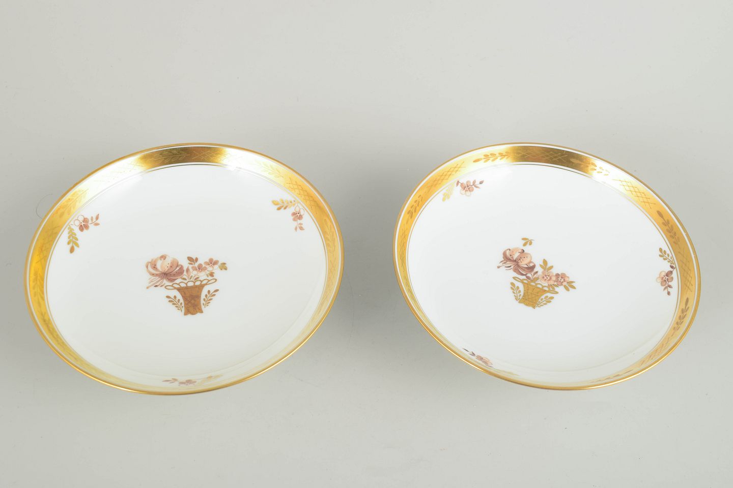 par opsatser i porcelæn fra Royal Copenhagens “Guldkurv”-serie, model 595/9269. Begge udført med forhøjet fod, bred forgyldt kant og håndmalet blomsterkurvmotiv.