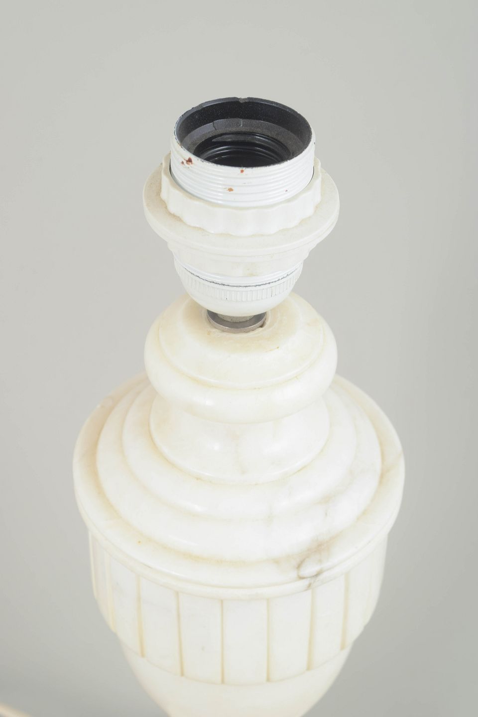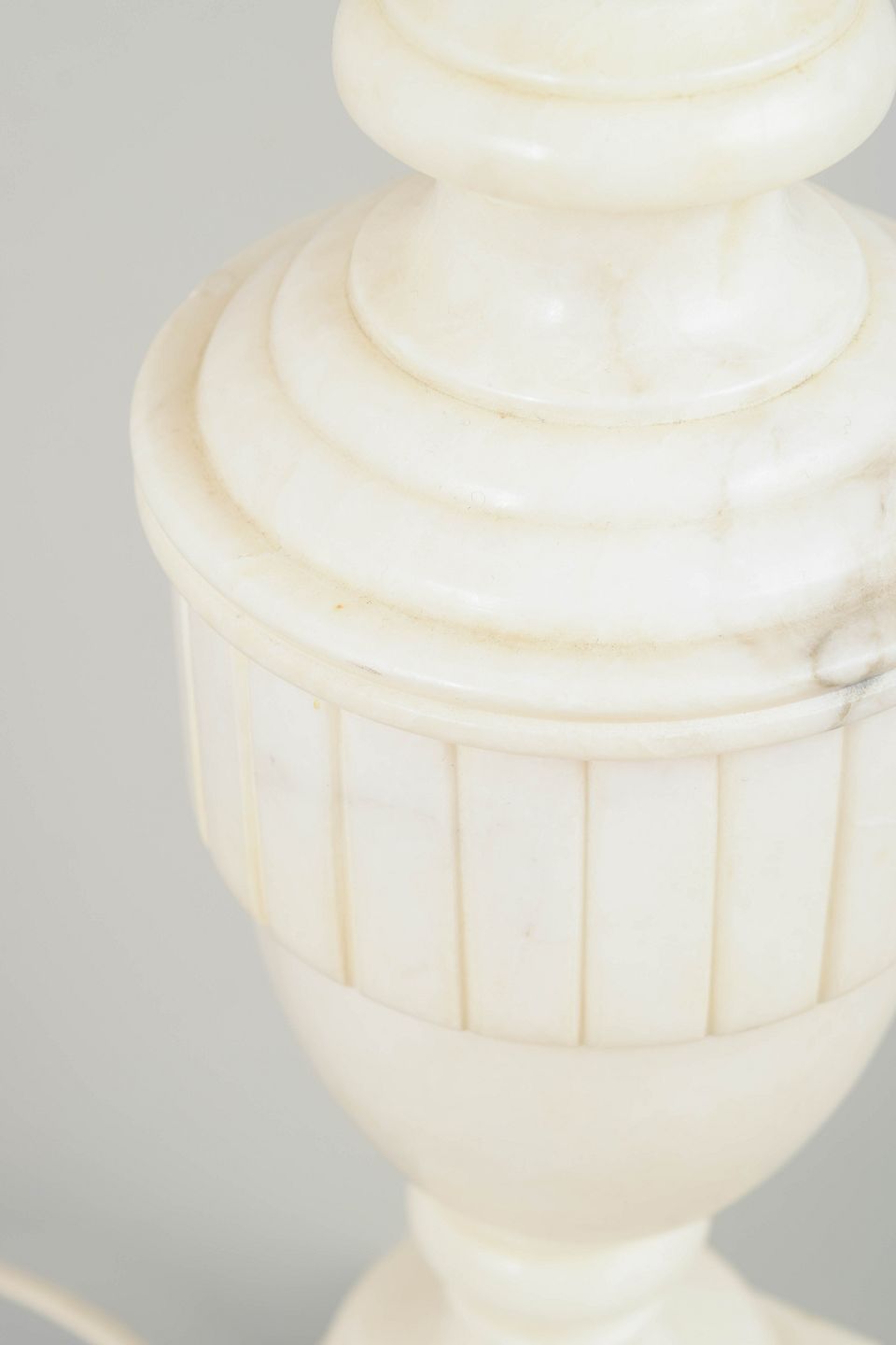 Klassisk formet bordlampe i hvid marmor med tydeligt profileret topstykke og vertikale riller på midterpartiet. Den enkle balusterform og den kvadratiske fod giver lampen et harmonisk og tidløst udtryk.