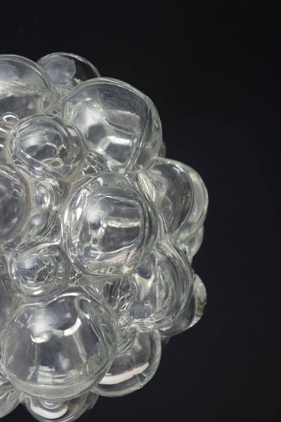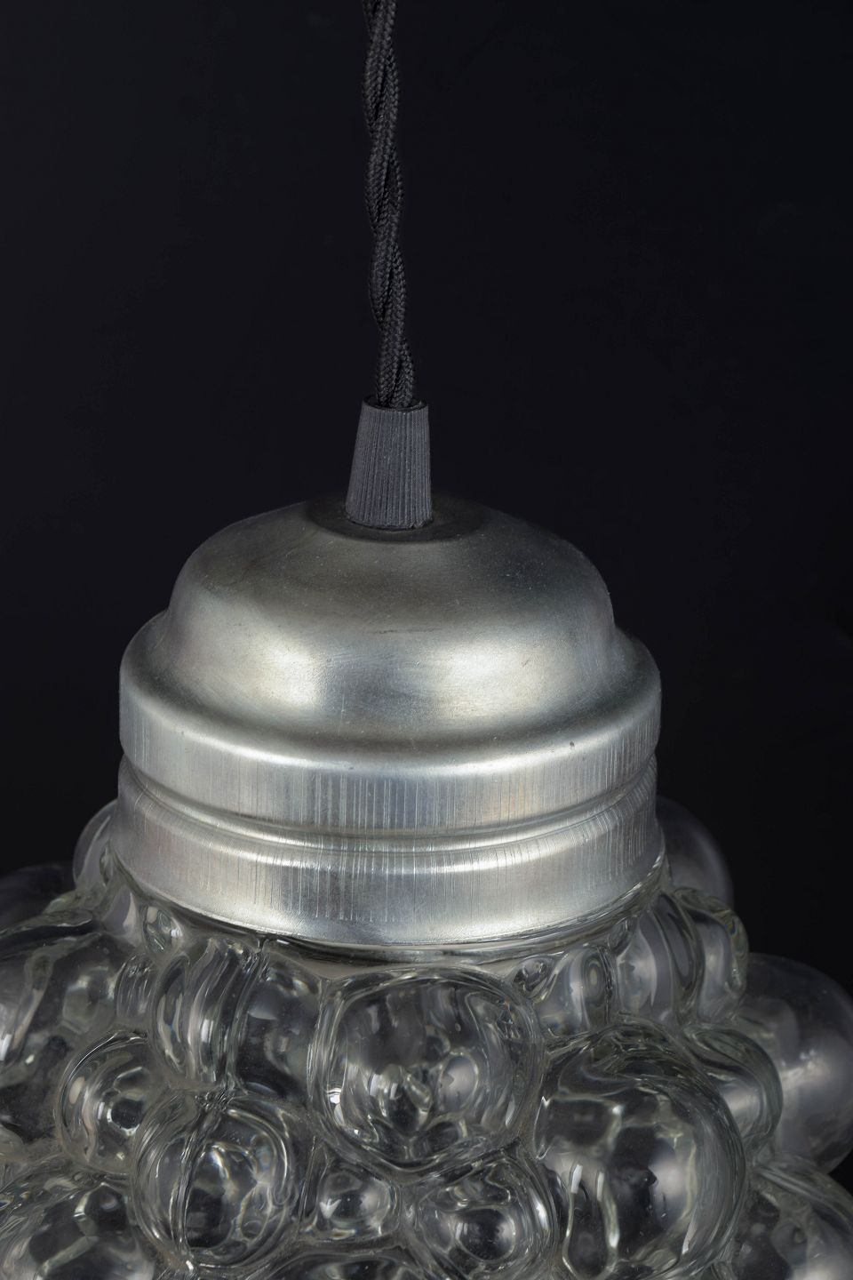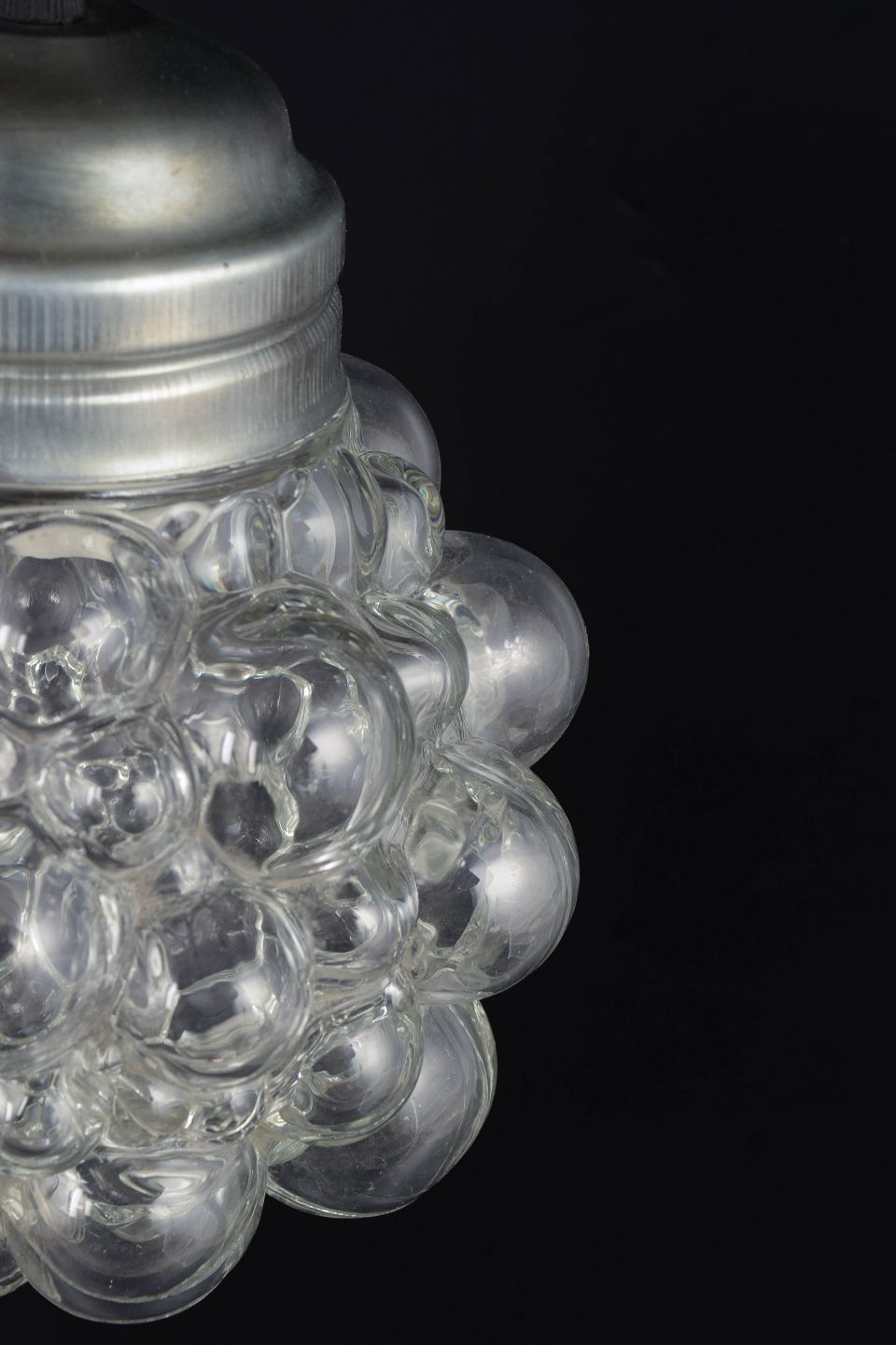 Klassisk pendel med den ikoniske bobleglas-kuppel bestående af klare, runde glasbobler, der skaber et levende lys- og skyggespil. Monteret med metalfatning i original stil. Et af Tynells mest kendte og elskede designs fra perioden.
