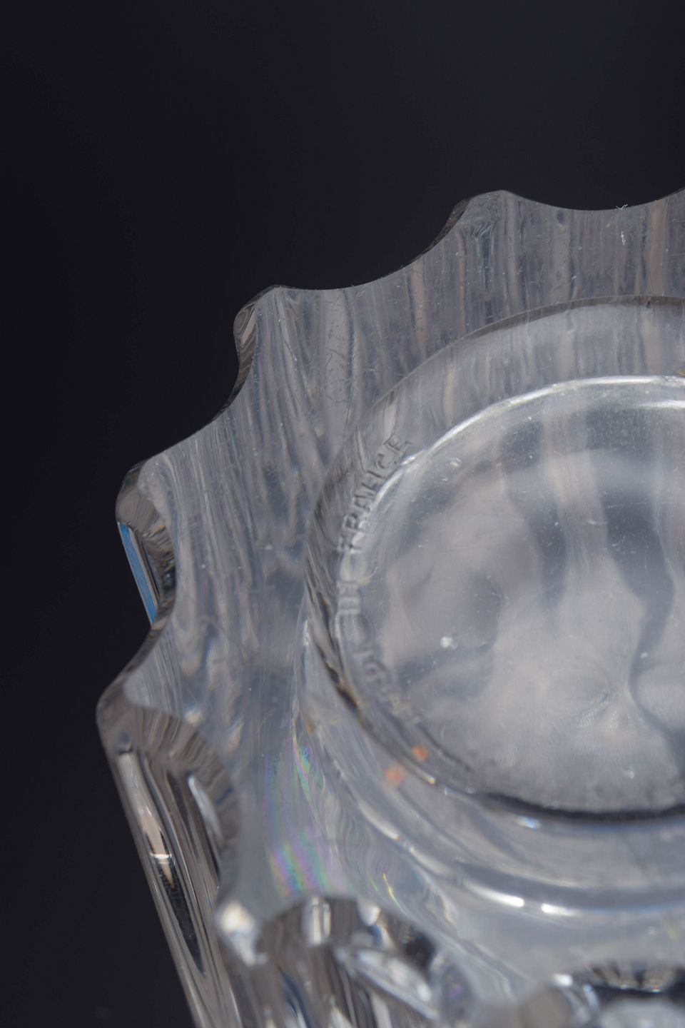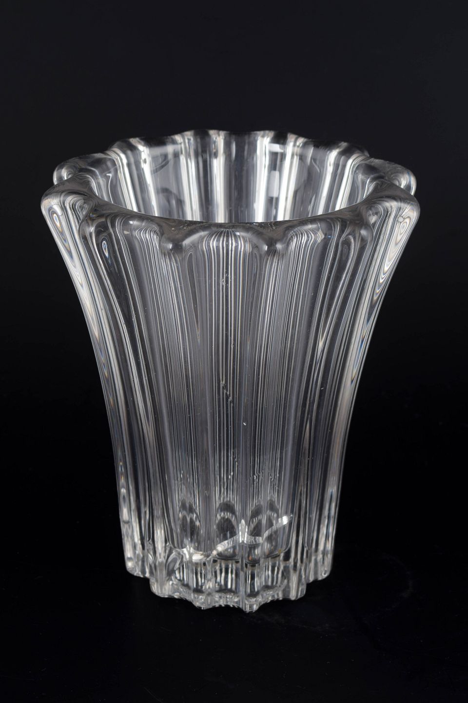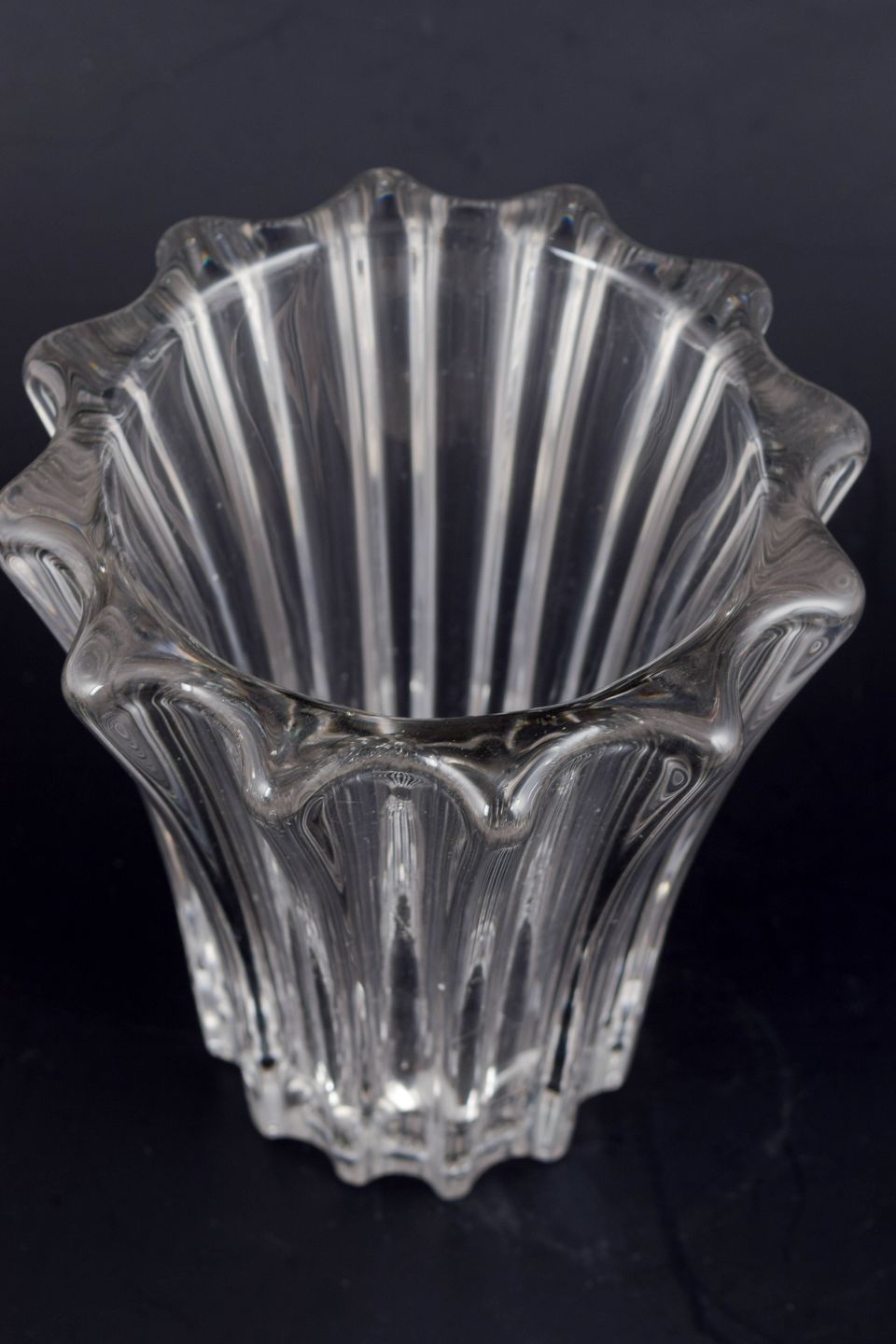 Klar art deco kunstglasvase med markante lodrette ribber og blødt bølget kant, udført i den karakteristiske stil kendt fra Pierre d’Avesns dekorative glasarbejder. Kombinationen af struktureret overflade og organisk åbning giver vasen et elegant, skulpturelt udtryk.