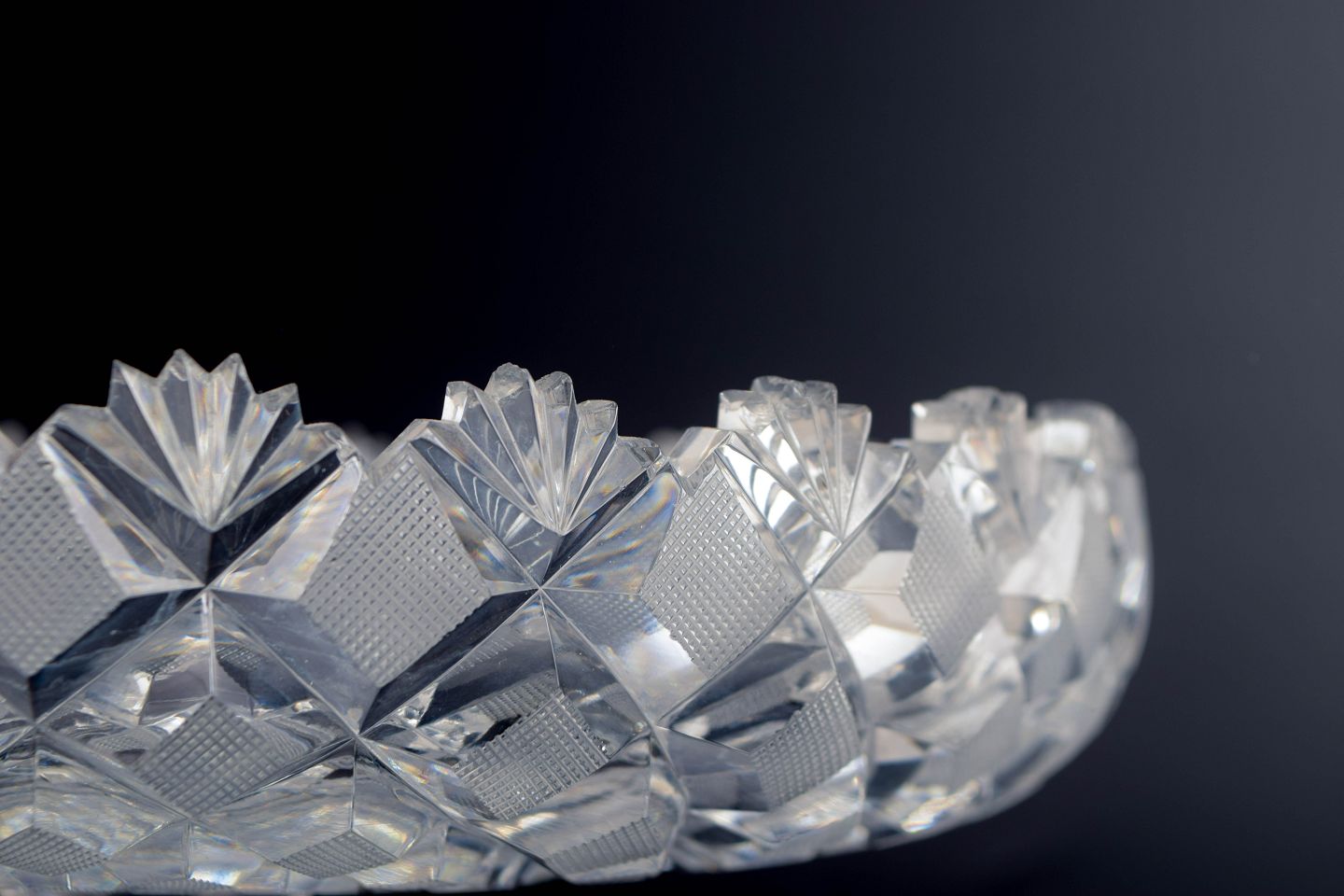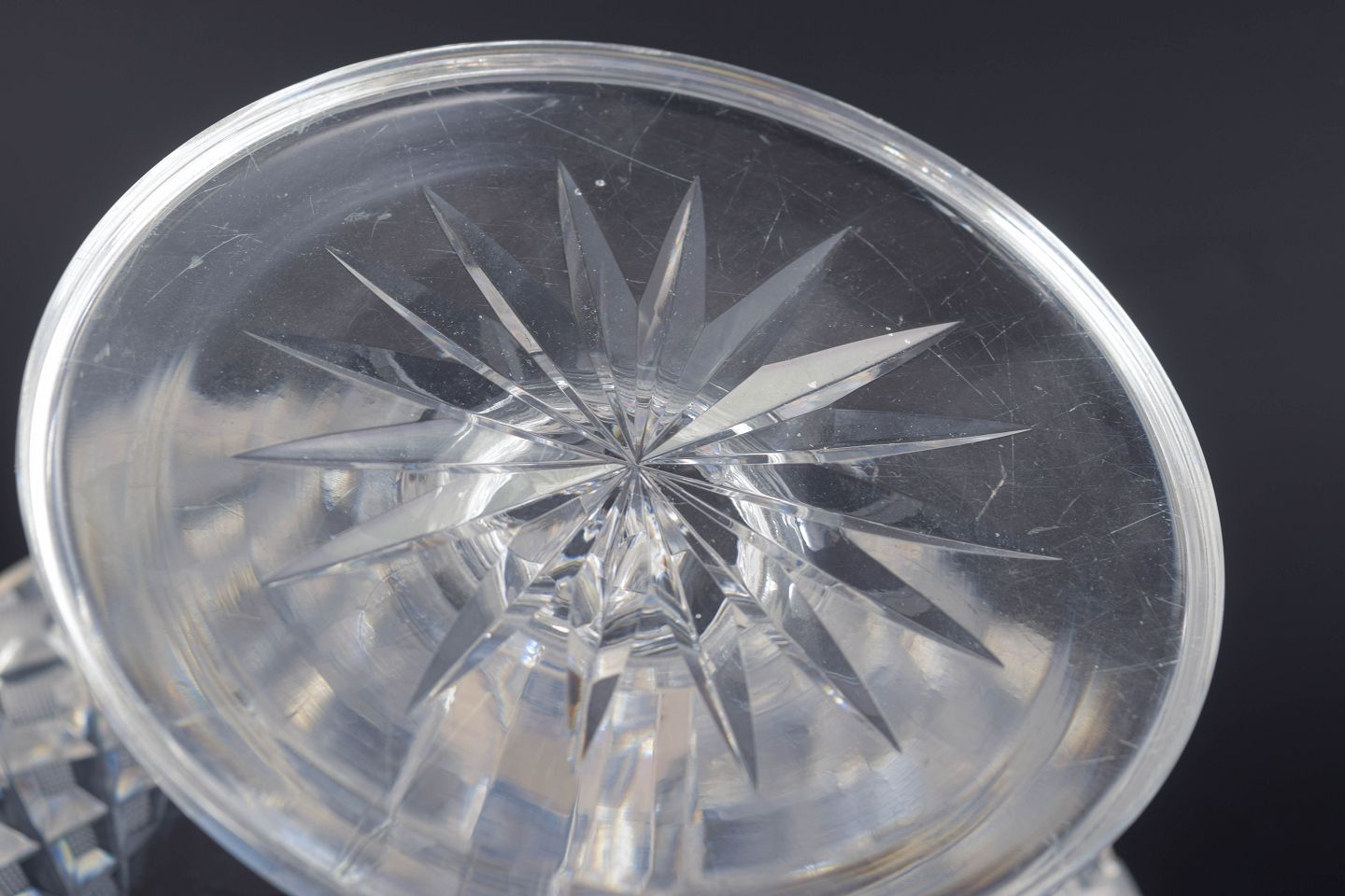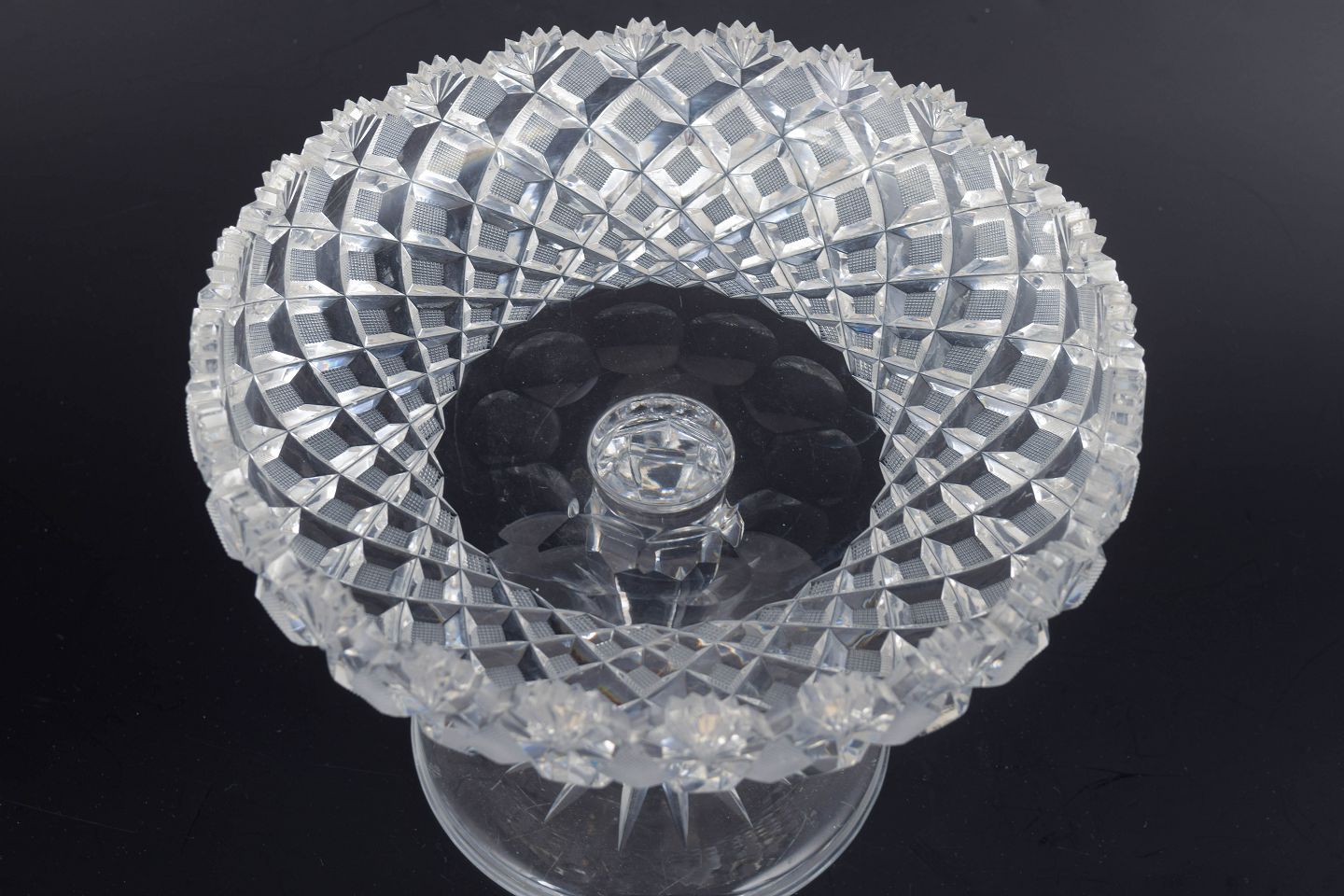 Elegant facetteret opsats i klart krystalglas med stjerneformet ornamentik langs kanten og en formet, facetslebet fod. Et klassisk eksempel på tidens dekorative glasarbejde, hvor geometri og lysrefleksion spiller en central rolle.