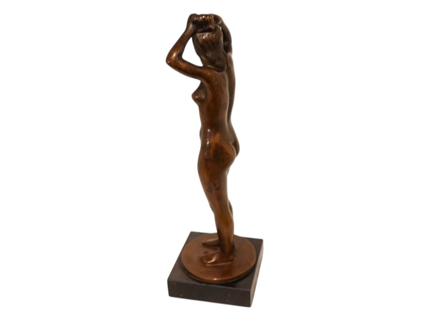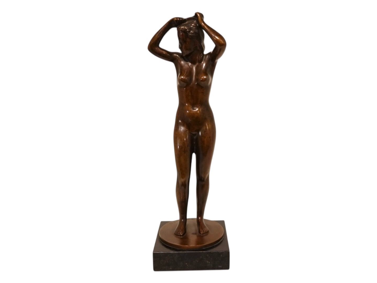 Volmer Bahner (1912-1995) bronze figur af nøgen dame der reder sit hår. Hun står på en sten sokkel.