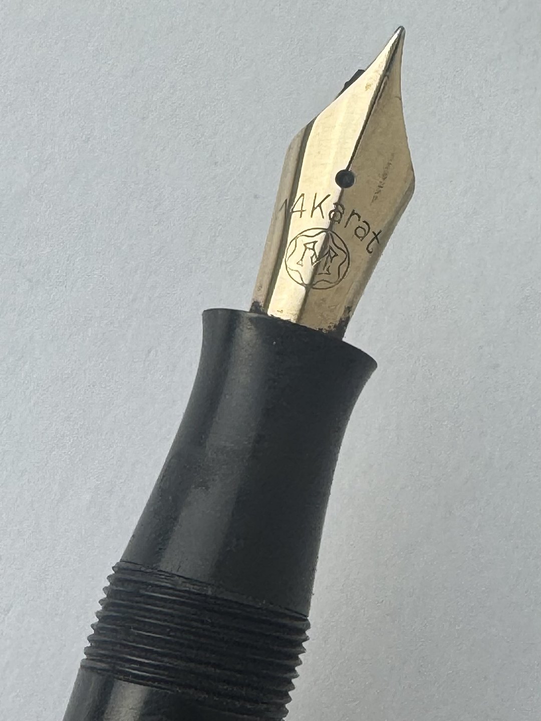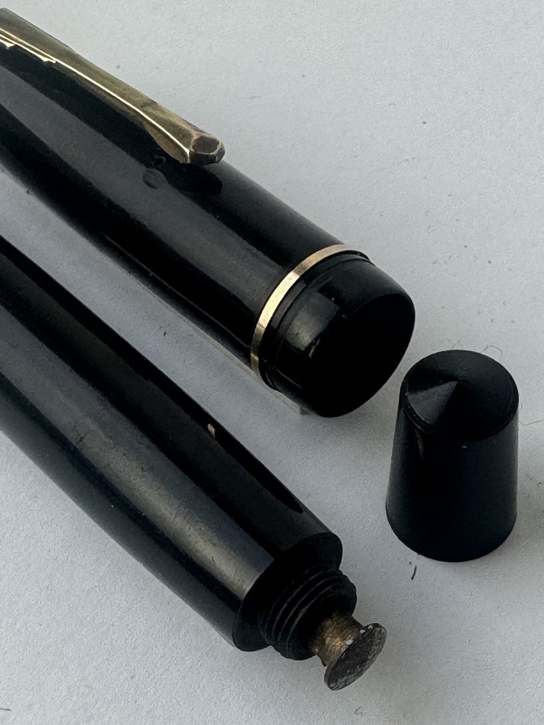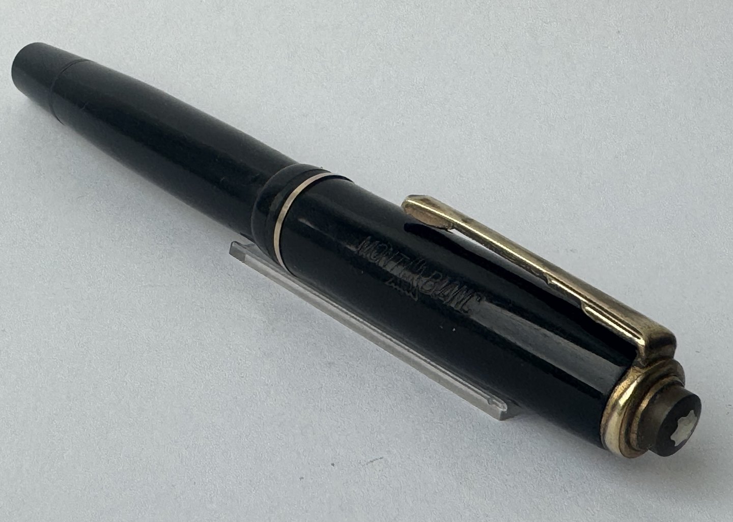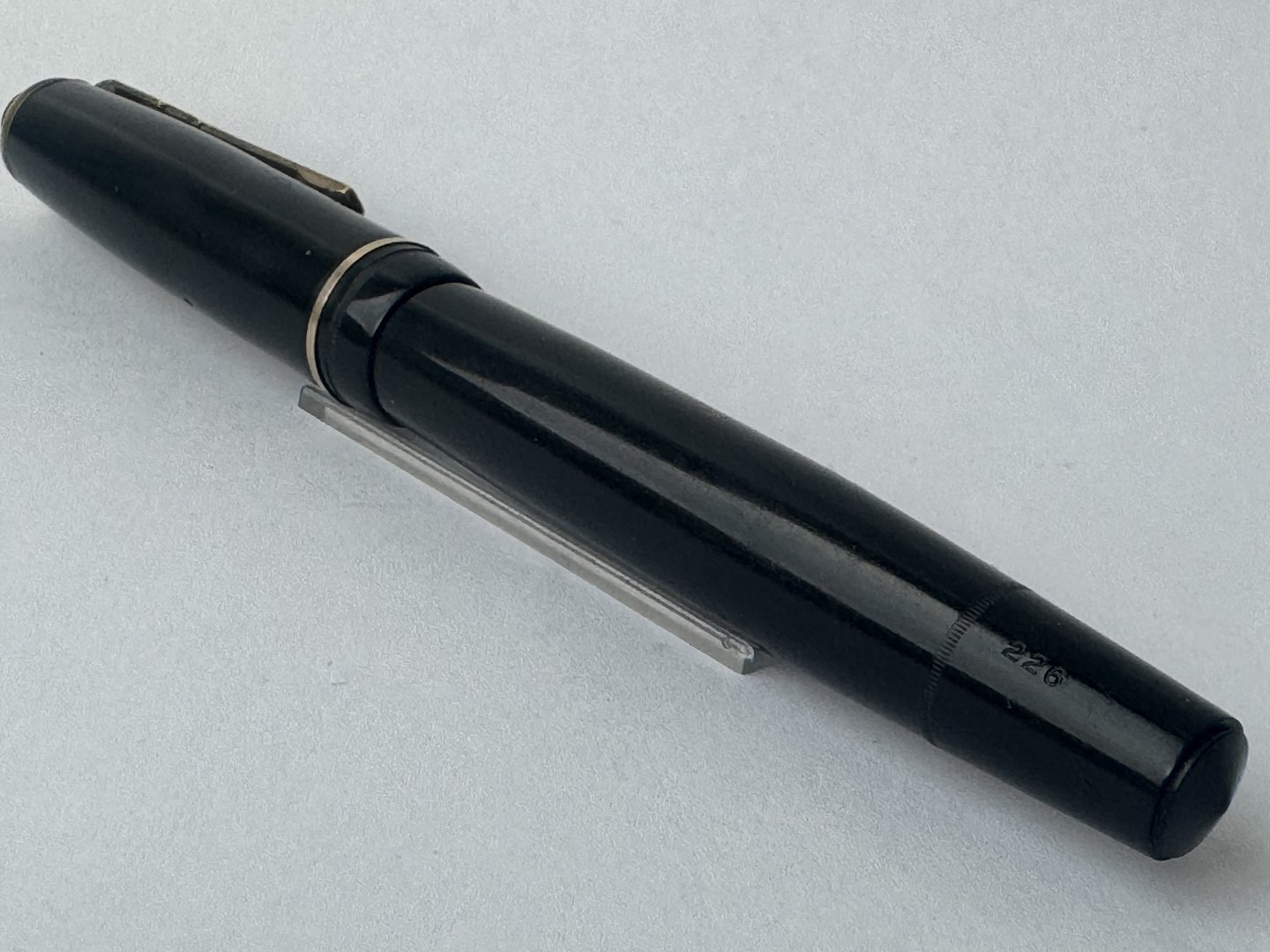 Sort Montblanc no. 226 fyldepen. Fremstillet i Danmark fra slutningen af 1940’erne. Mangler et mavebælte på hætten. Ellers i god stand uden skader eller reparationer. Hætten mærket med MONTBLANC den lille sorte bundskrue med modelnummeret 226. Der skal indsættes en ny gummisæk, før end den igen kan optage blæk og skrive påny.