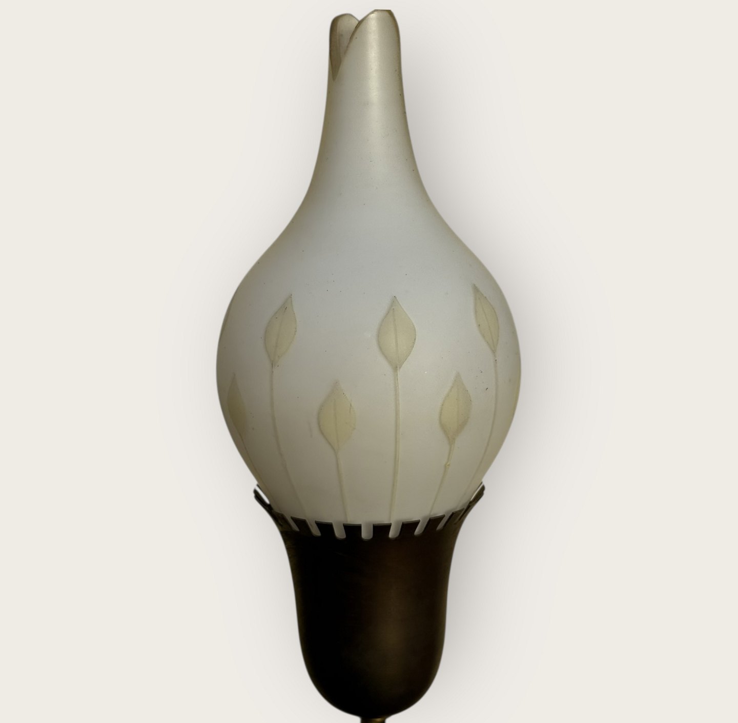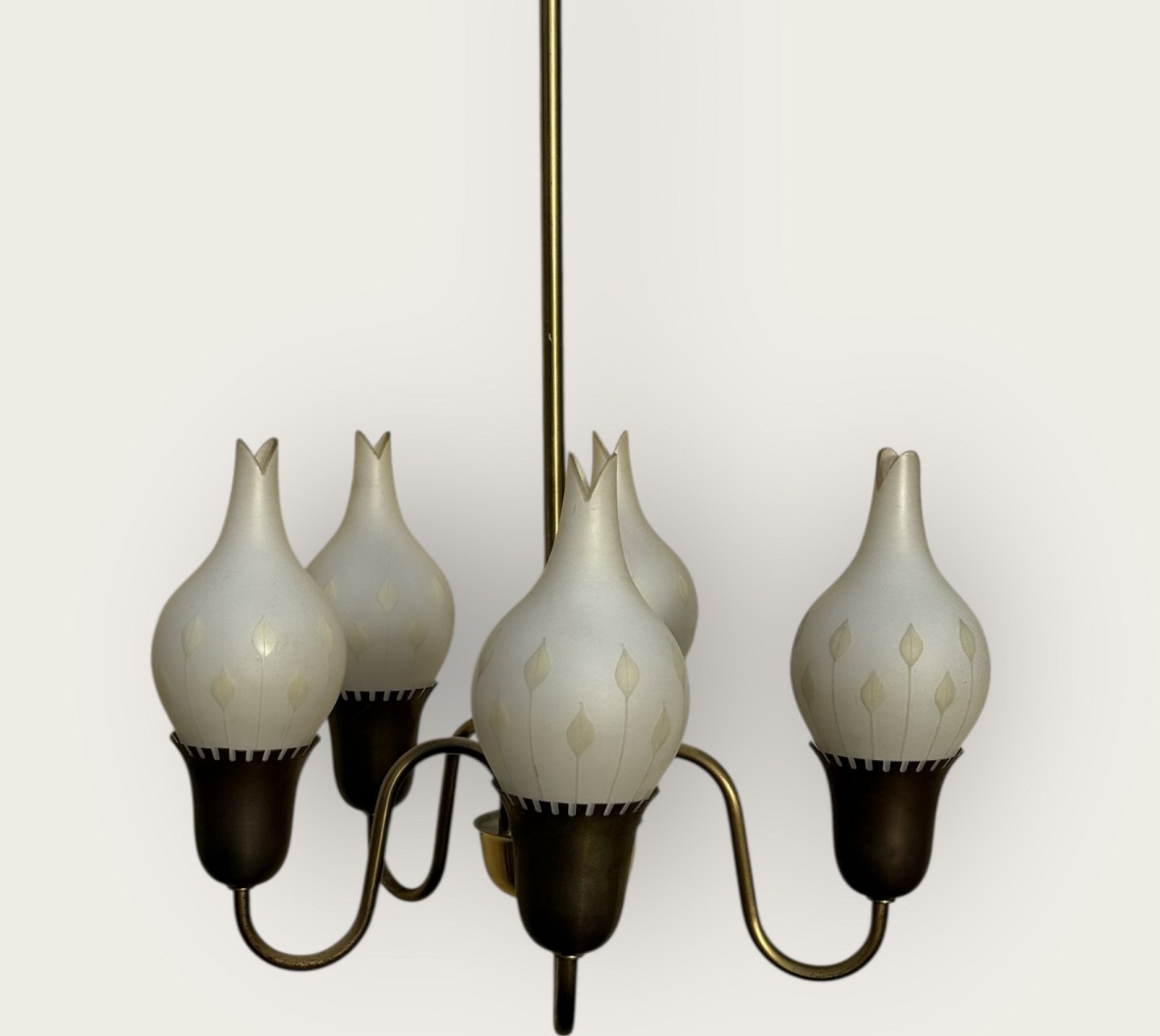 Kronleuchter aus Messing mit Glasschirmen, 5 große, tulpenförmige Schirme, vermutlich von Fog & Mørup gefertigt, jeder Schirm ca. 20 cm hoch und 10 cm im Durchmesser, die Lampe selbst 42 cm im Durchmesser und 67 cm hoch. *Hervorragender Zustand*