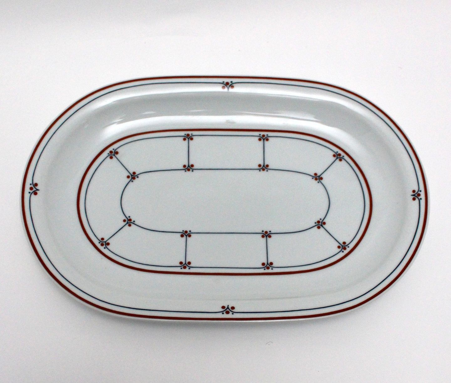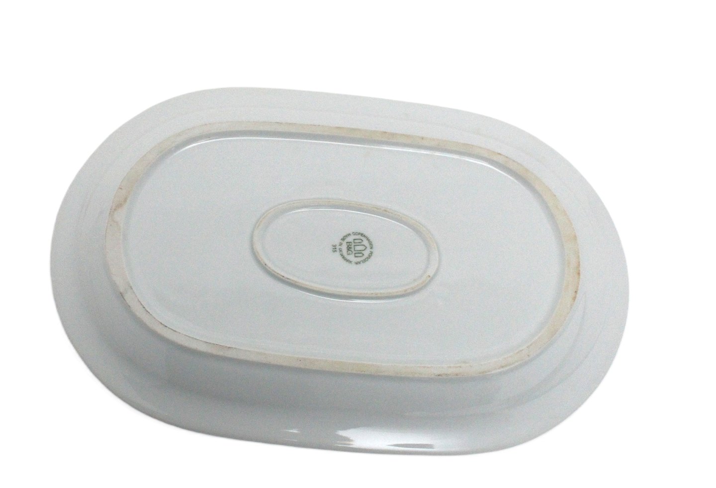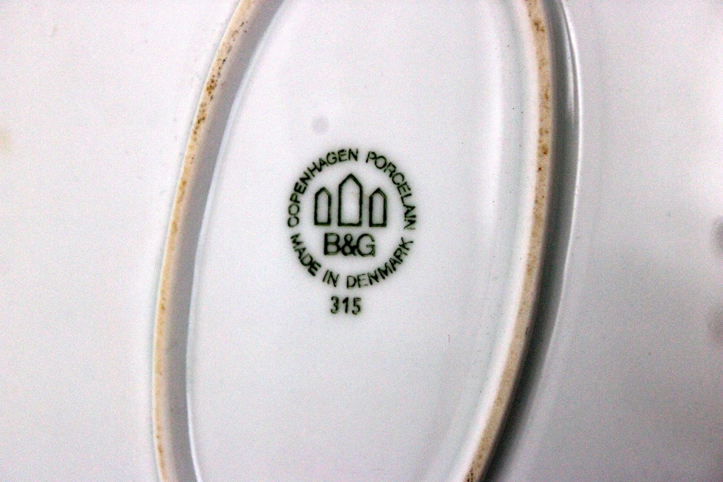 Text zugänglich auf Dänische: Bing & Grøndahl, Serveringsfad. Nr. 315. Designet af Martin Hunt. Længde 36 cm. Bredde 23 cm. II sortering. Almindelig brugsslid, brugsstreger. Pris: 400 kr. stk. Lager: 1