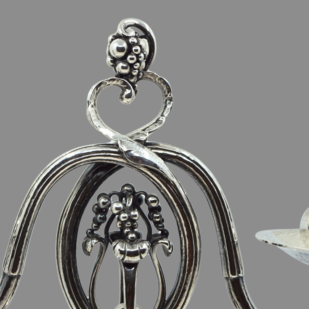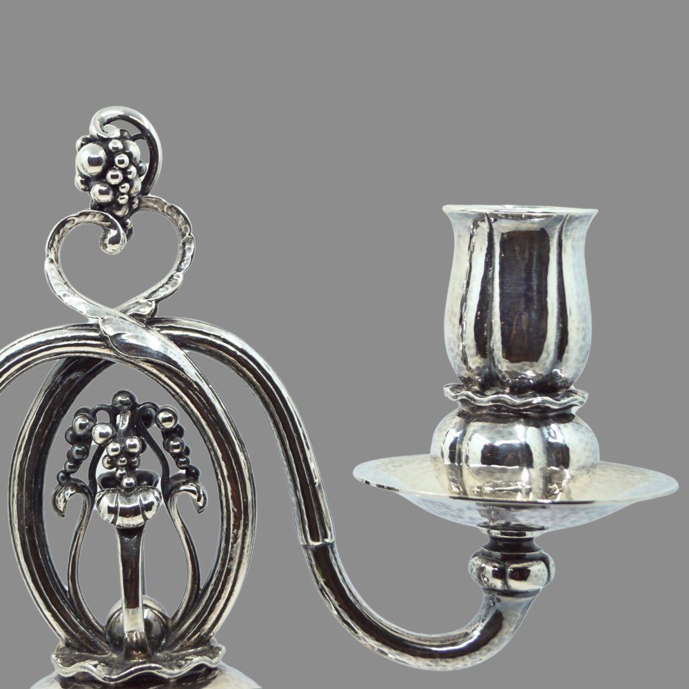Text zugänglich auf Dänische: Georg Jensen; Massiv to armet kandelaber i hamret sterling sølv, prydet med druer og granatæble. Designet af Georg Jensen omkring 1914-1918. Dessin nr. 324.