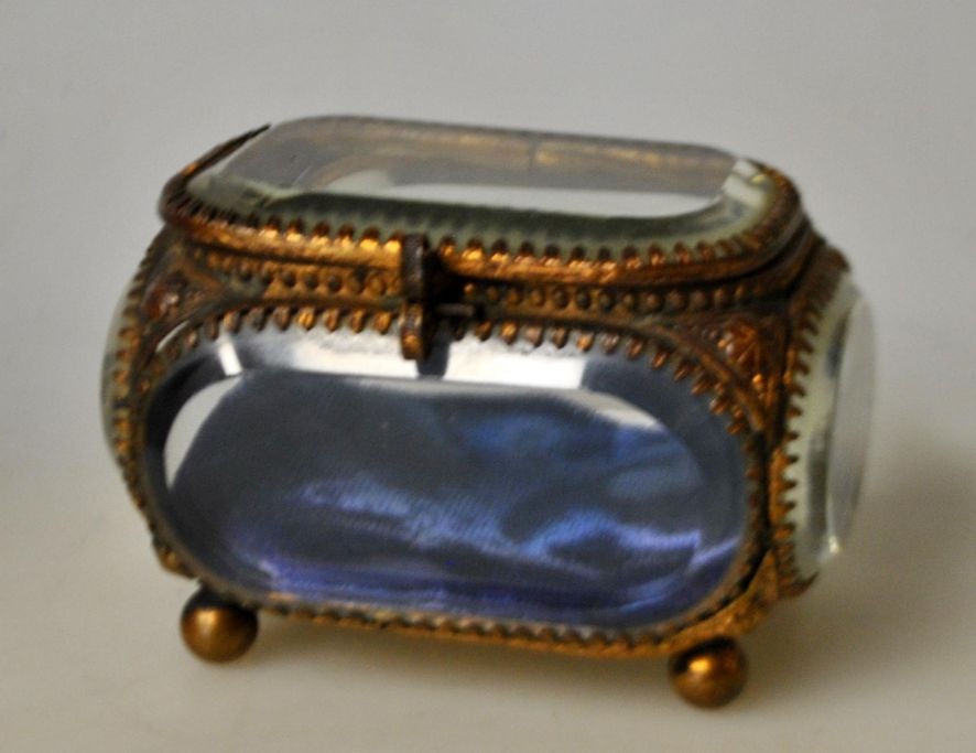 Schmuckkästchen, um 1900. Frankreich. Mit facettiertem Glas, verziertem Messingrahmen und vier Füßen. 6,5 x 5,5 x 8 cm.