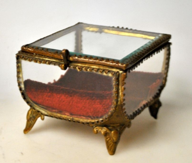 Schmuckkästchen, Frankreich, um 1900. Mit facettiertem Glas, verziertem Messingrahmen und vier Füßen. 8,5 x 8,5 x 7 cm.