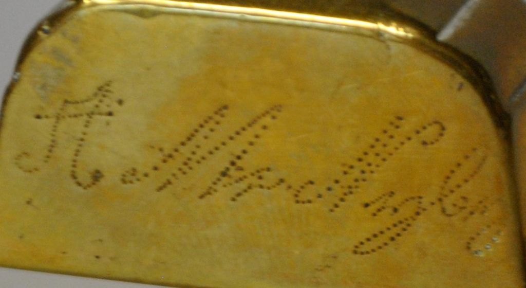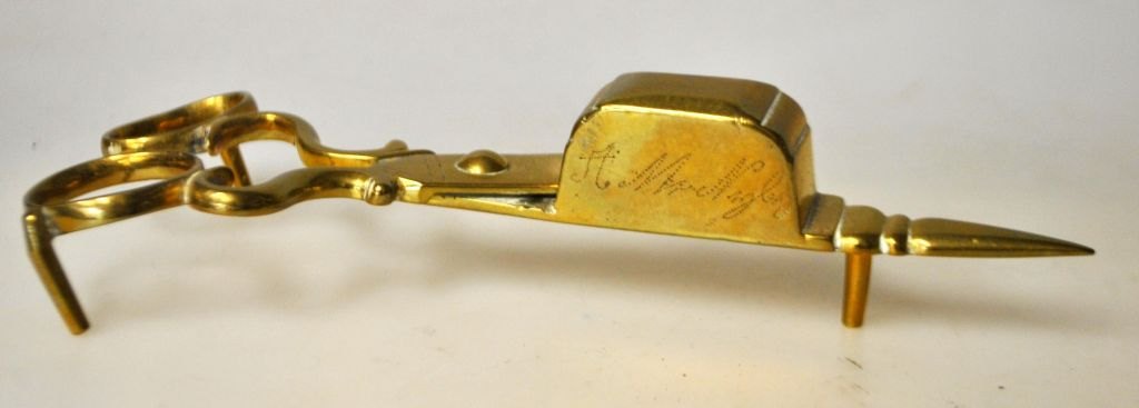 Kerzenlöscher aus Messing, 19. Jahrhundert. Dänemark. Länge: 16 cm. Mit Inschrift: AM Nyborg.