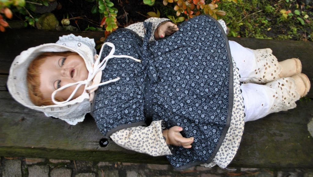 Antike Puppe mit Geräuschen, 19. Jahrhundert. Deutschland. Kopf und Gliedmaßen aus Verbundmaterial. Körper aus Segeltuch. Blaue Augen mit Wimpern, die sich öffnen und schließen lassen. Macht Geräusche beim Schaukeln. Kleidung aus Baumwolle und Lackschuhe. Länge: 48 cm.