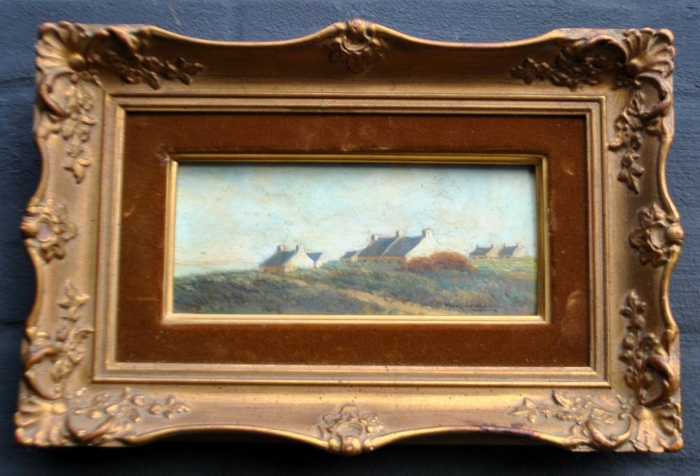 Deschamps, Margaret (19. Jahrhundert) Frankreich: Häuser am Meer. Öl auf Holz. Signiert. 9 x 21 cm.