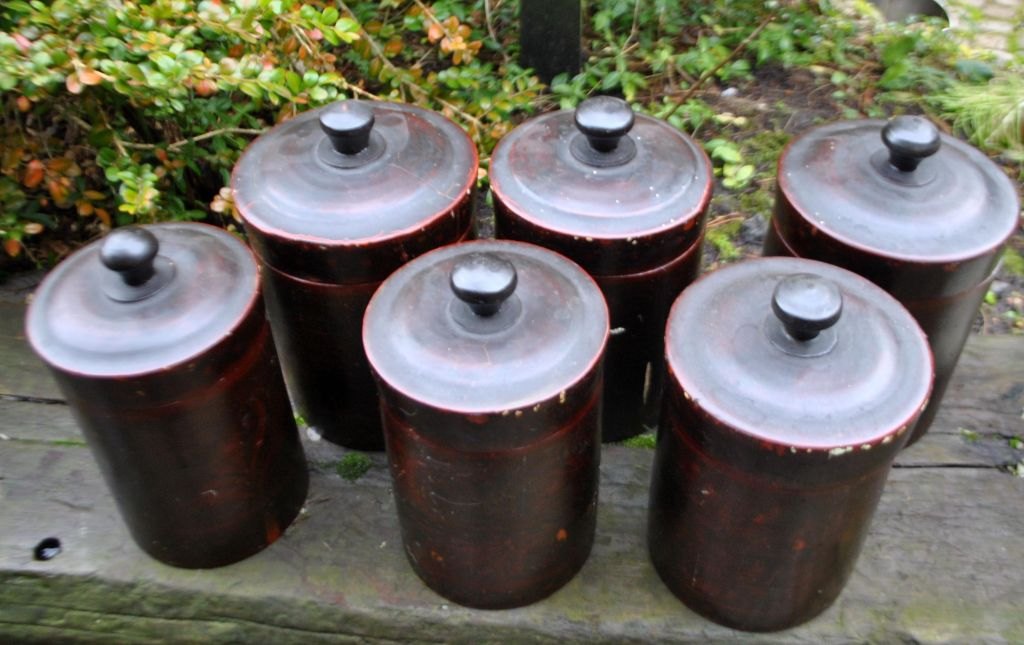 Sammlung russischer Holzkästchen aus dem 19. Jahrhundert. Gedrechseltes und ausgehöhltes Holz. Außen bemalt und lackiert. Innen silberfarben. Insgesamt 5 Stück. Hinweis: Nur als Set erhältlich!