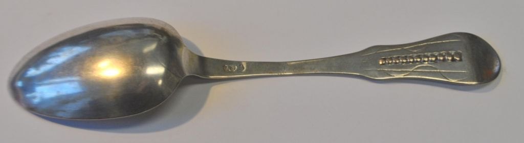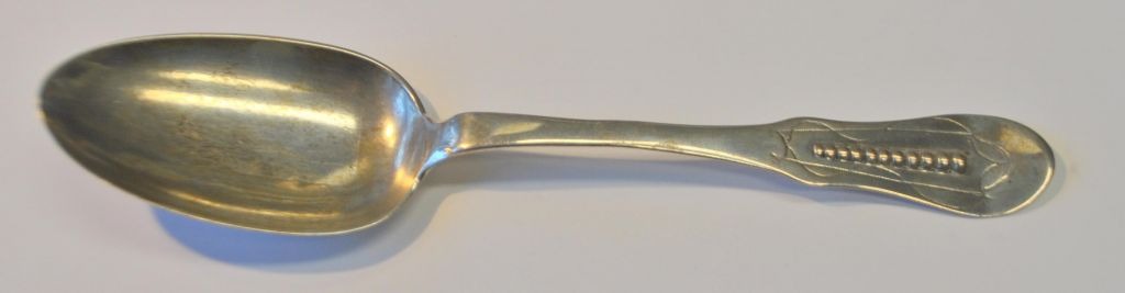 Andreas Christian Bödewatt (1736–1815), Tønder, Dänemark: Silber Speiselöffel. Mit Verzierungen am Griff. Gestempelt mit Meister- und Stadtmarke. Länge: 20,5 cm. Ohne Gravuren.