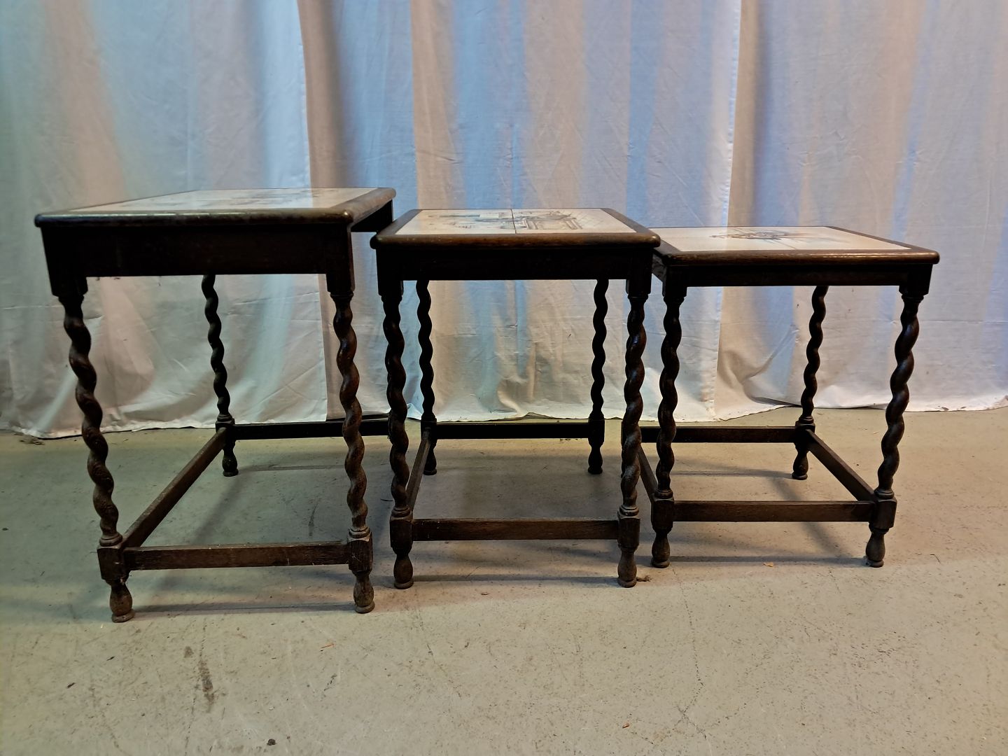 3 Indskudsborde i massivt egetræ med kakler, fra 19330erne.