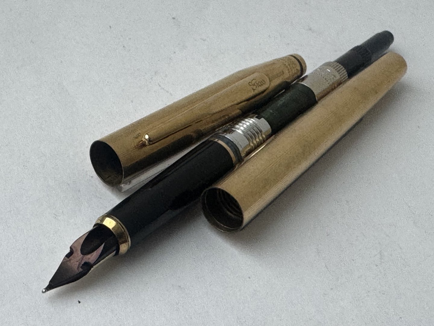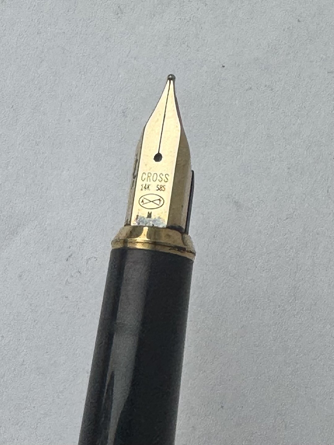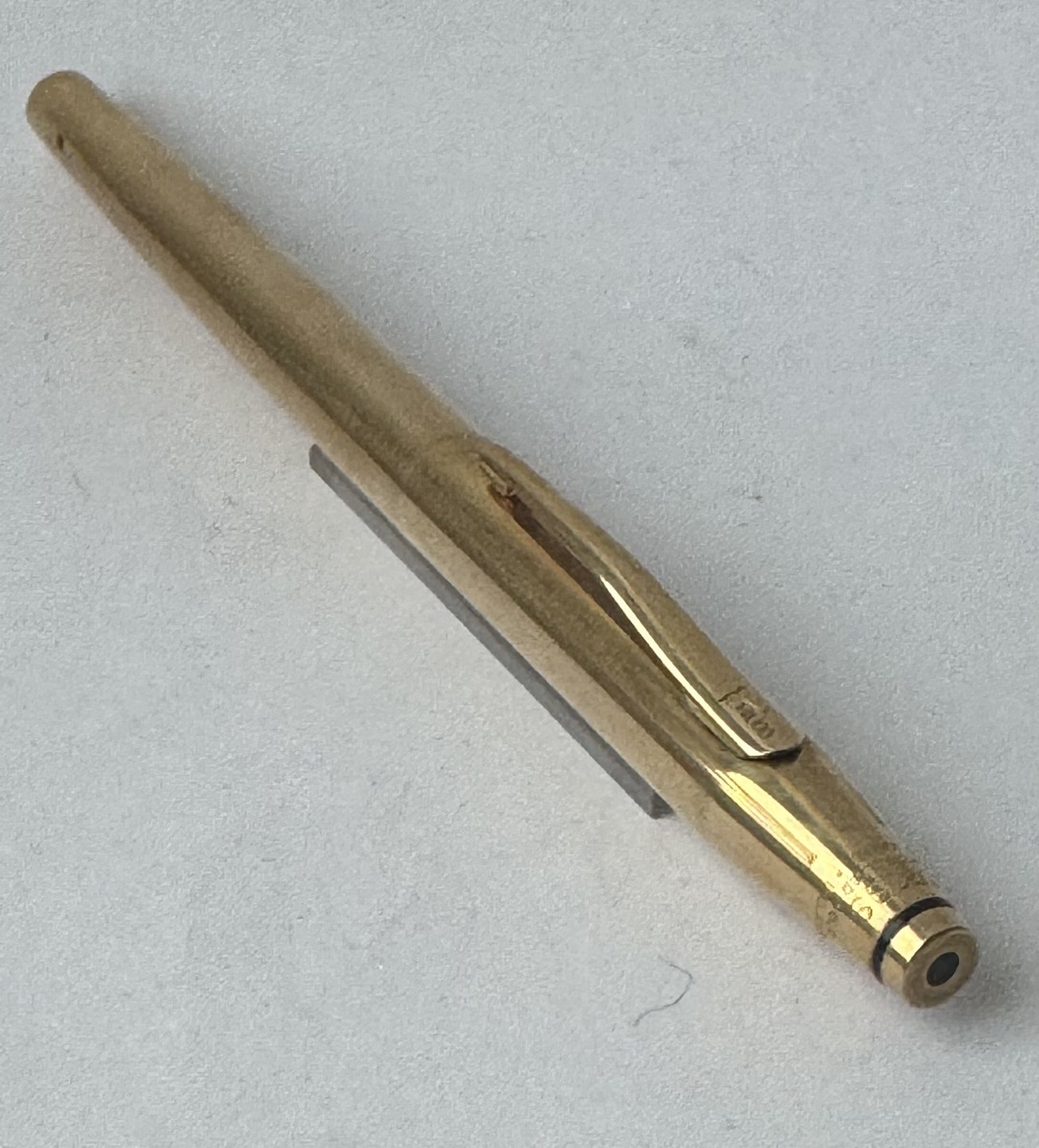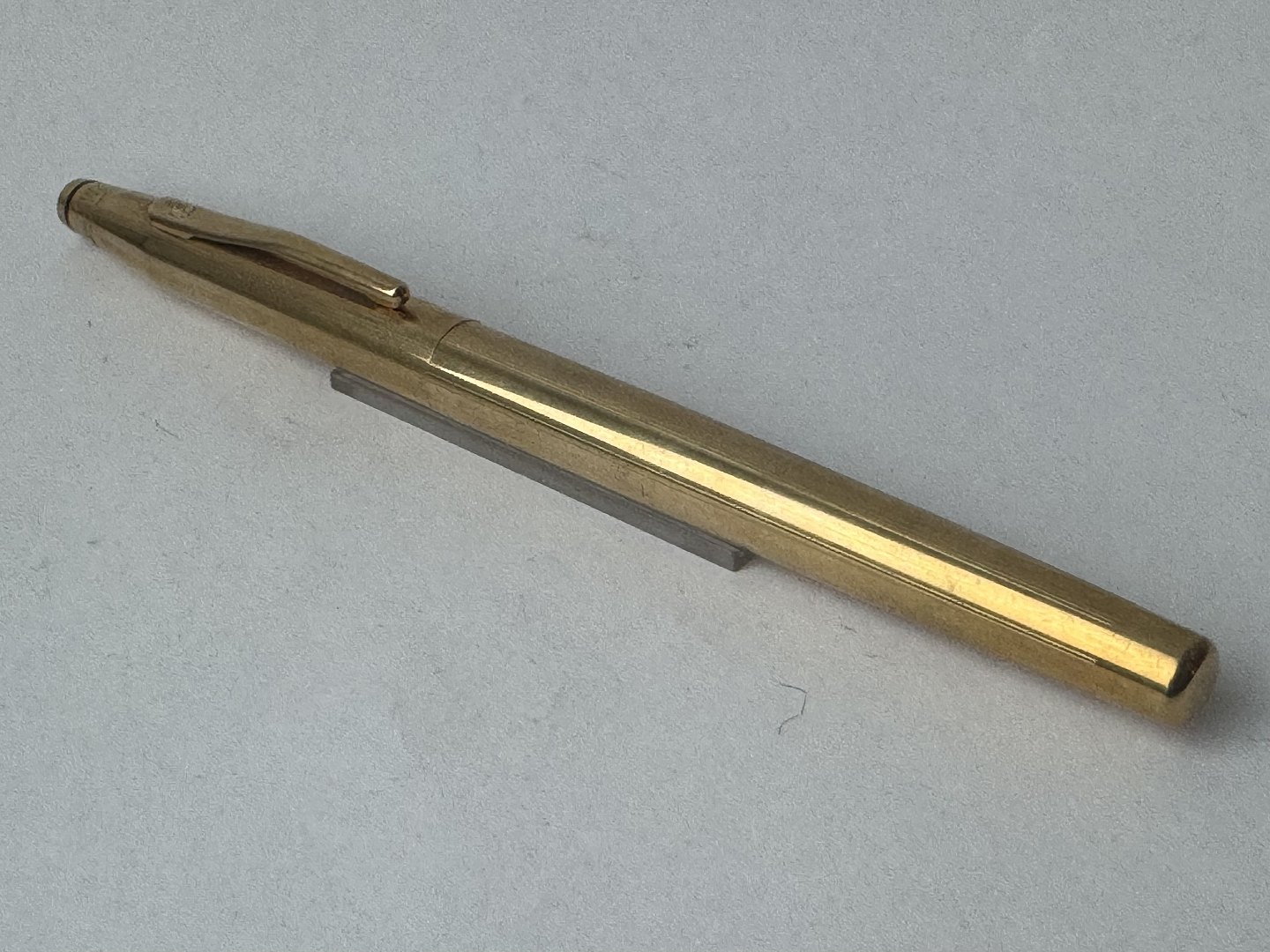 Cross fyldepen i guld-duble med piston filler blæk-påfyldningssystem. Alle dele originale inklusiv en 14 karat guldspids. Fremstår i god stand og klar til at blive brugt. L. 13,4 cm