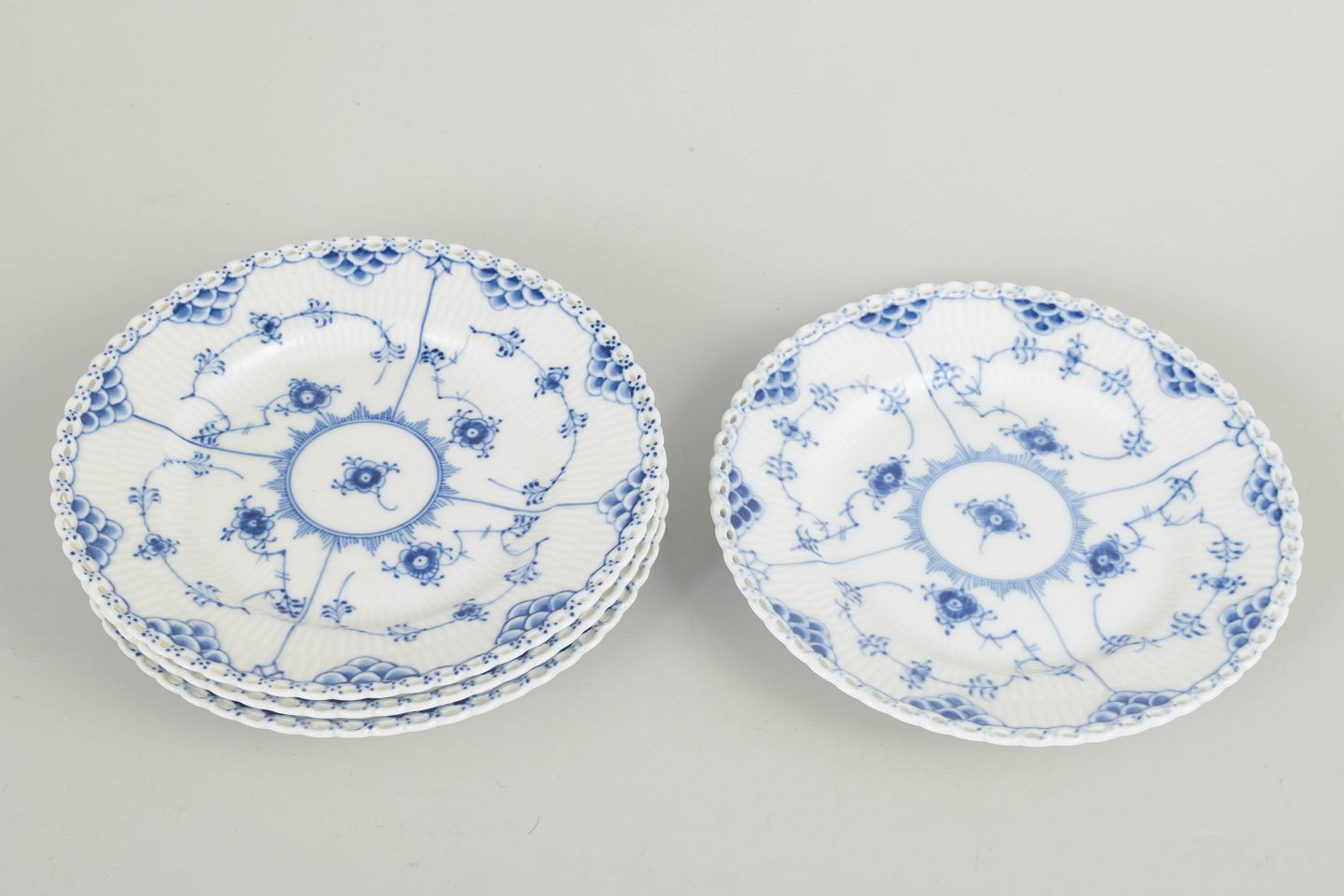 Tallerkener i Musselmalet helblonde med gennembrudt blondekant og håndmalet koboltblå dekoration. Udført i klassiske riflede former og velegnet som frokost- eller desserttallerkener.