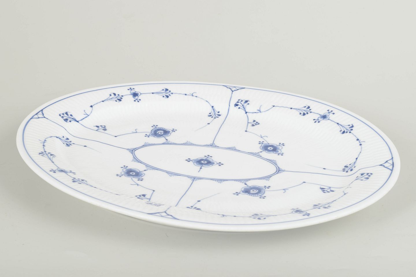 Ovalt serveringsfad i Musselmalet riflet, udført i den klassiske riflede form uden blondekant og dekoreret med håndmalet koboltblå underglasur. Et enkelt og funktionelt serveringsfad, typisk for Royal Copenhagens produktion i mellemkrigstiden.